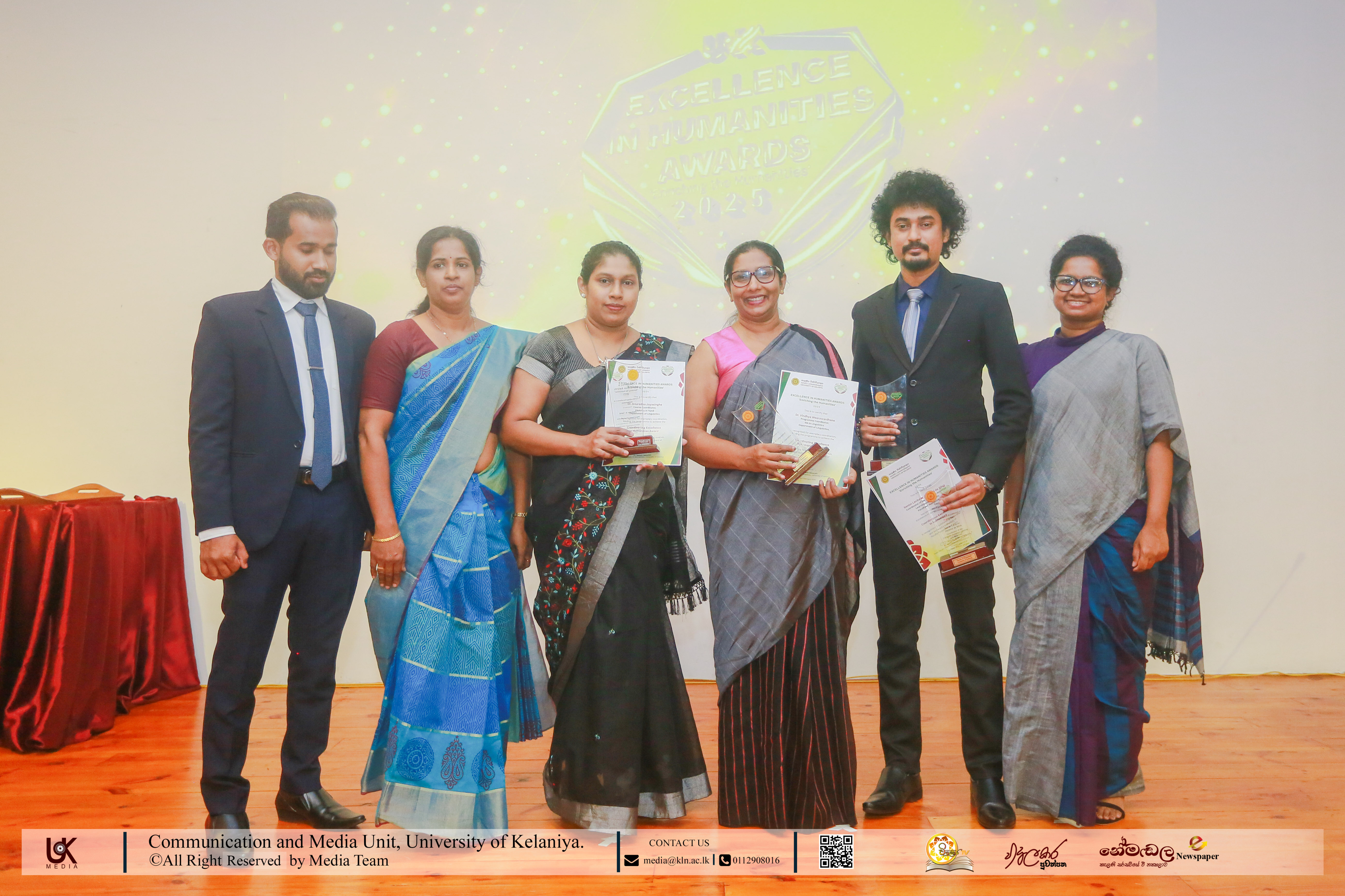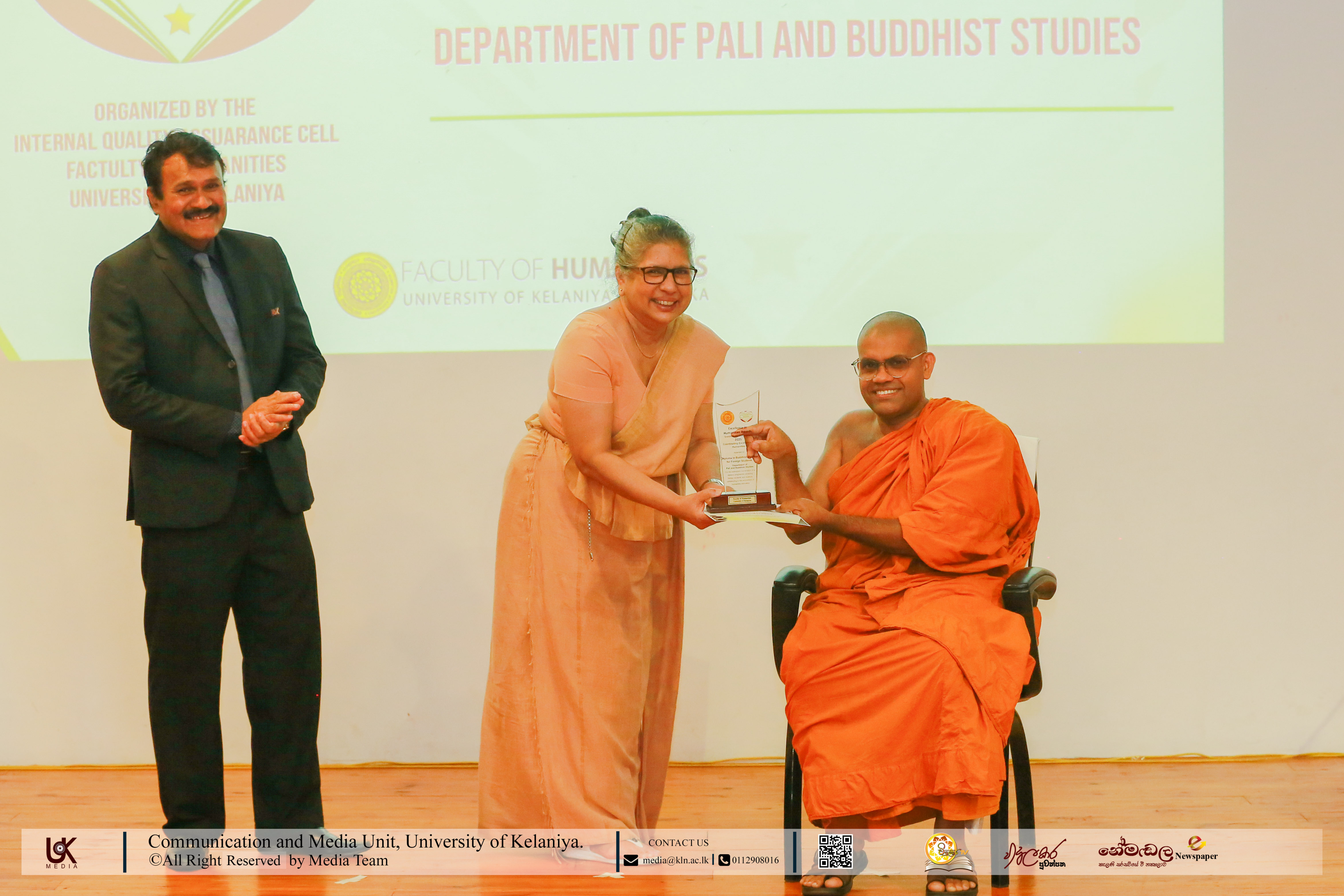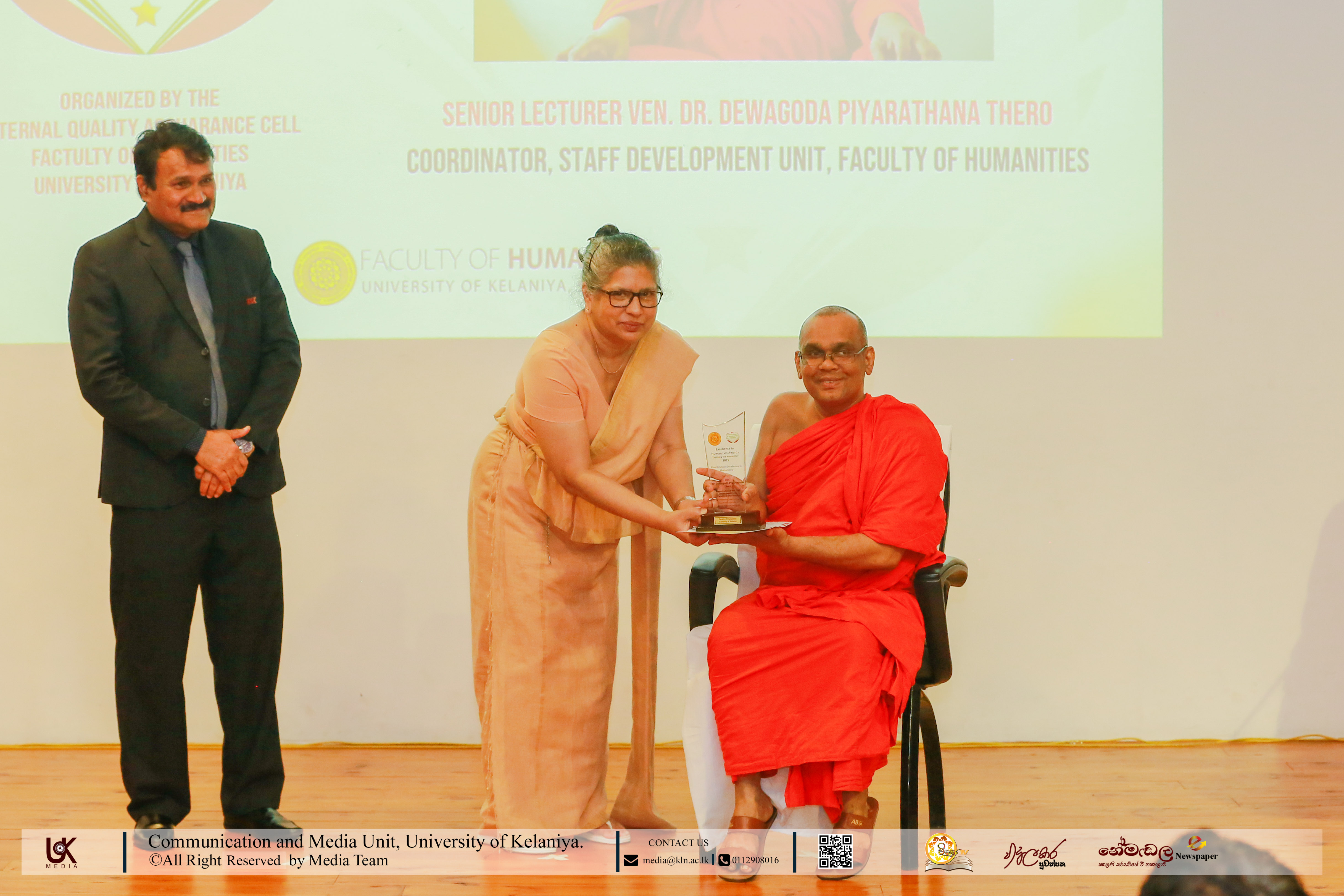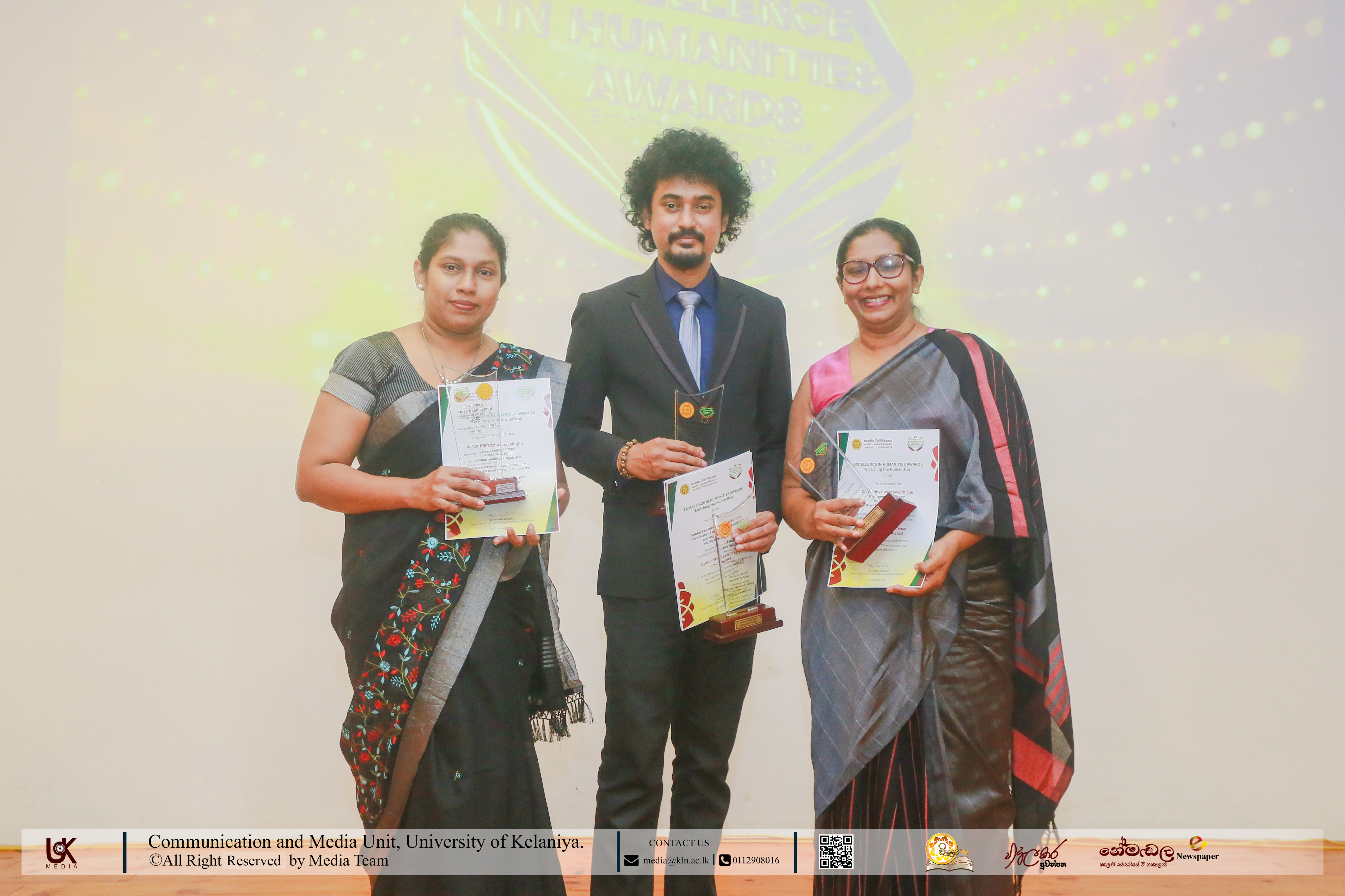 Under Contribution Excellence in Humanities, awards were presented to Ven. Dr Dewagoda Piyarathana Thero, Department of Sanskrit & Eastern Studies; Senior Lecturer Gevani Prahalathan, Department of English Language Teaching; Senior Lecturer Sulochana Rathnayake, Department of Modern Languages; Senior Lecturer Ven. Muwapetigewela Pagngnaloka Thero, Department of Pali and Buddhist Studies, Senior Lecturer B. B. M. Jayasundara, Department of Sinhala; Senior Lecturer Hasara Dasuni Hirimuthugoda, Department of Hindi Studies; Senior Lecturer Jayamal de Silva, Department of Linguistics; and Dr R. M. S. Priyadarshani, Education Unit.