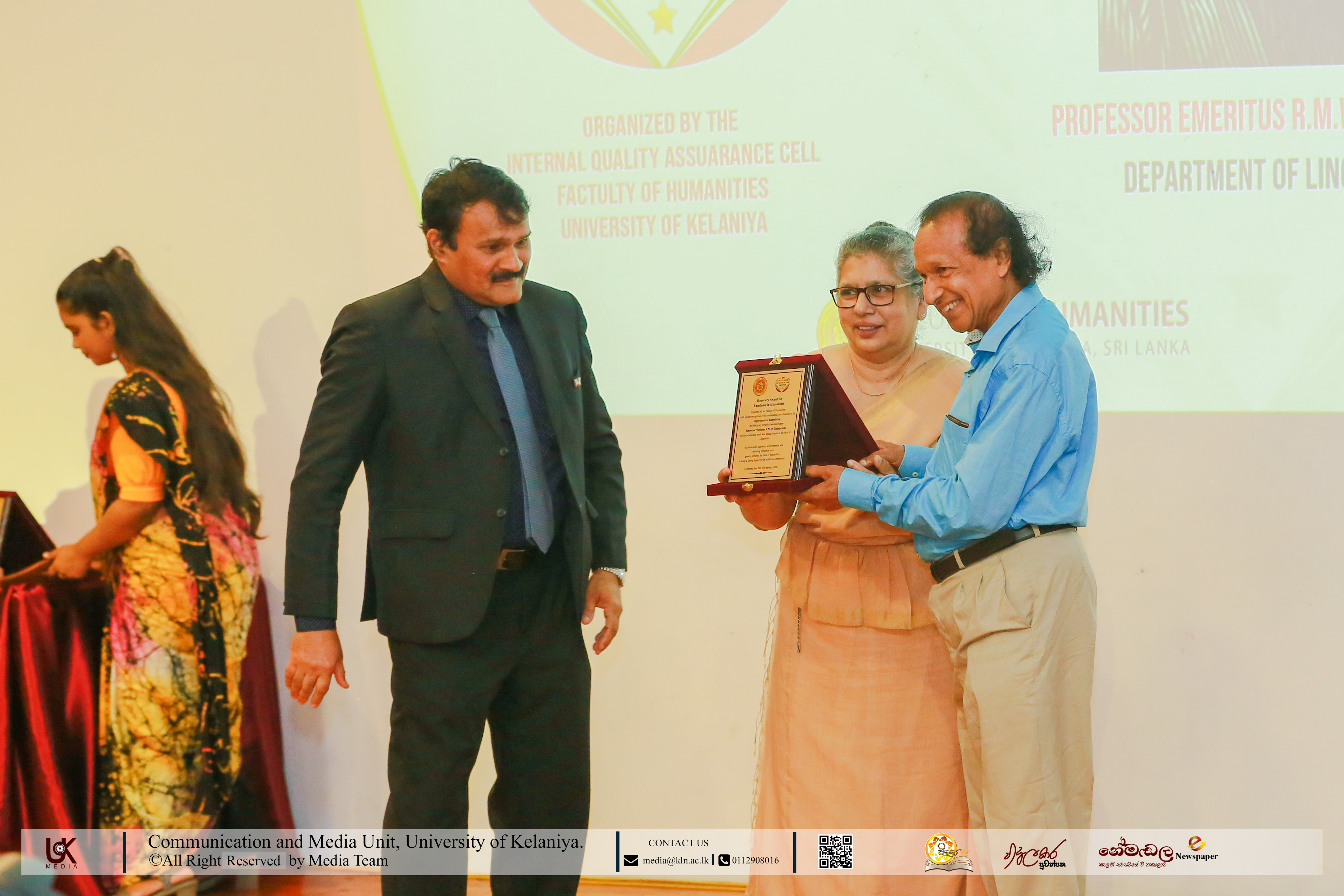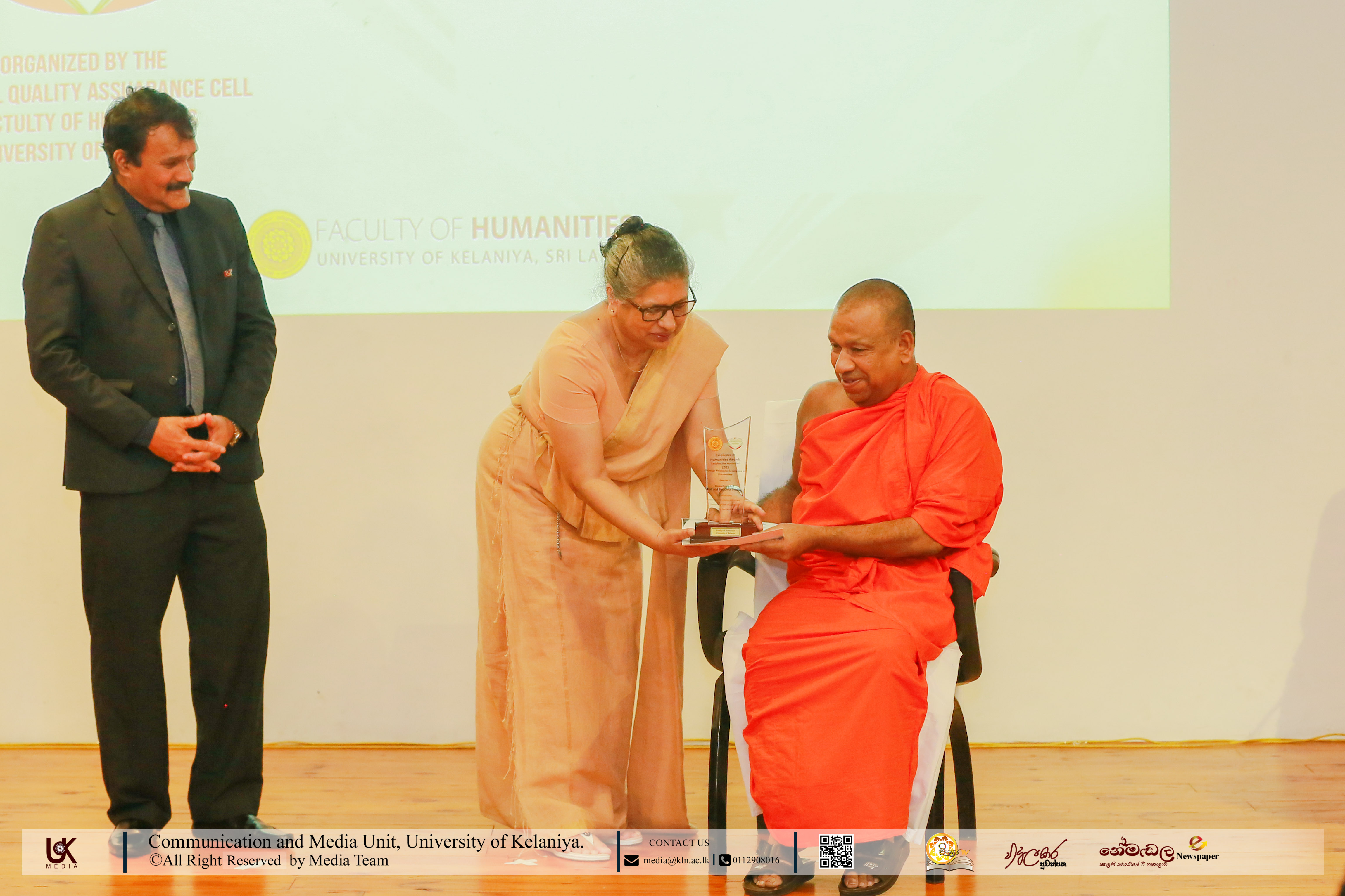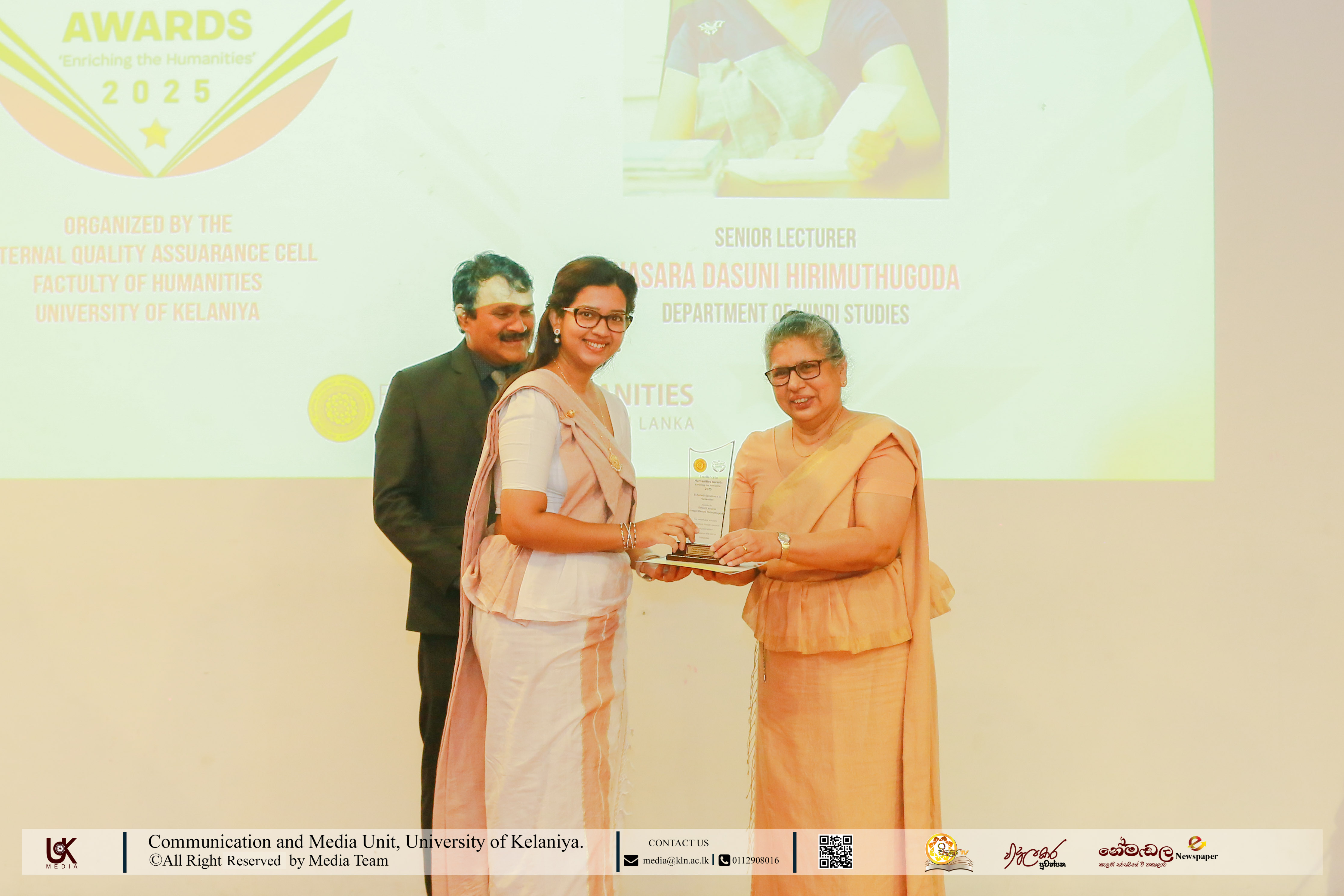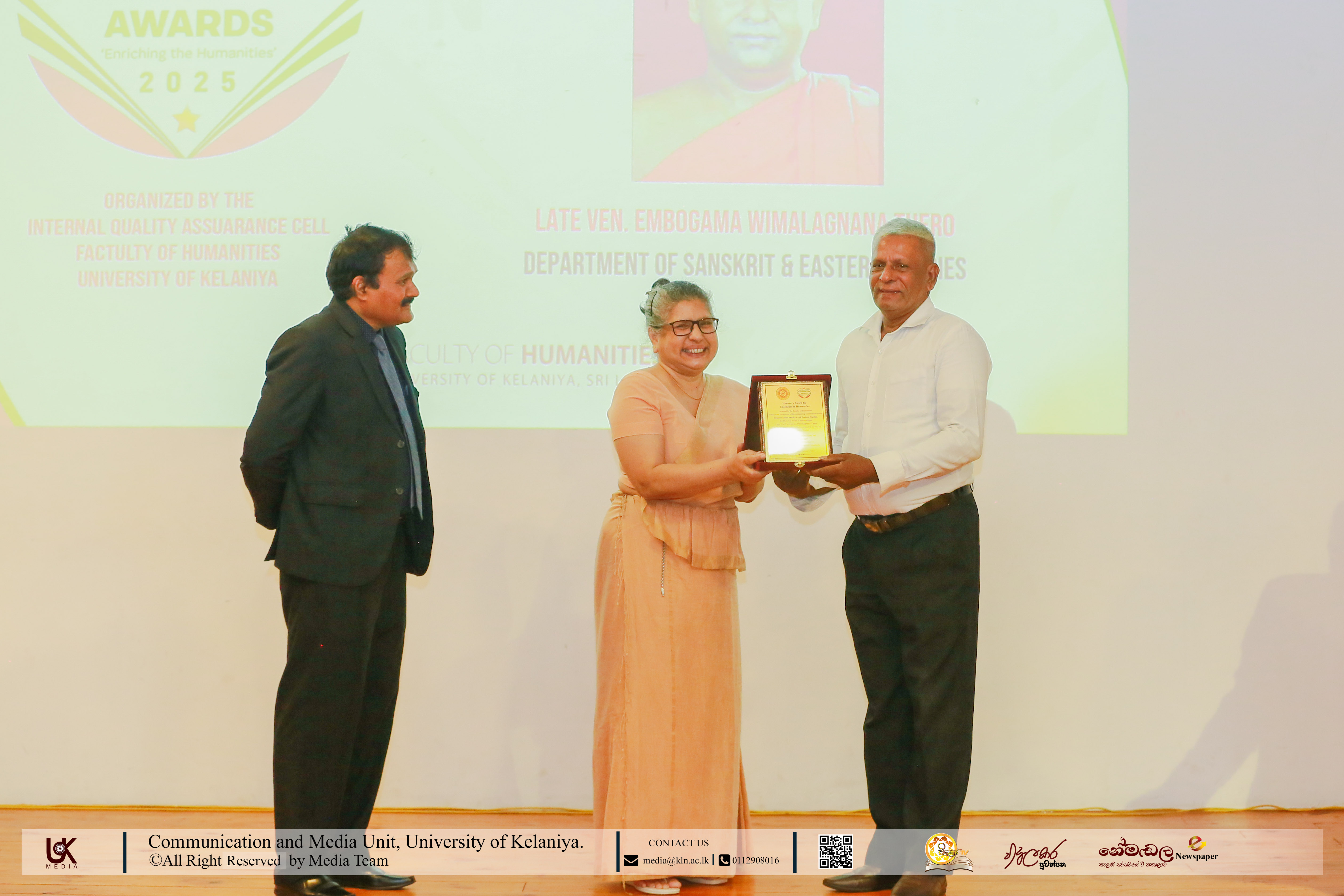 Under Contribution Excellence in Humanities, awards were presented to Ven. Dr Dewagoda Piyarathana Thero, Department of Sanskrit & Eastern Studies; Senior Lecturer Gevani Prahalathan, Department of English Language Teaching; Senior Lecturer Sulochana Rathnayake, Department of Modern Languages; Senior Lecturer Ven. Muwapetigewela Pagngnaloka Thero, Department of Pali and Buddhist Studies, Senior Lecturer B. B. M. Jayasundara, Department of Sinhala; Senior Lecturer Hasara Dasuni Hirimuthugoda, Department of Hindi Studies; Senior Lecturer Jayamal de Silva, Department of Linguistics; and Dr R. M. S. Priyadarshani, Education Unit.