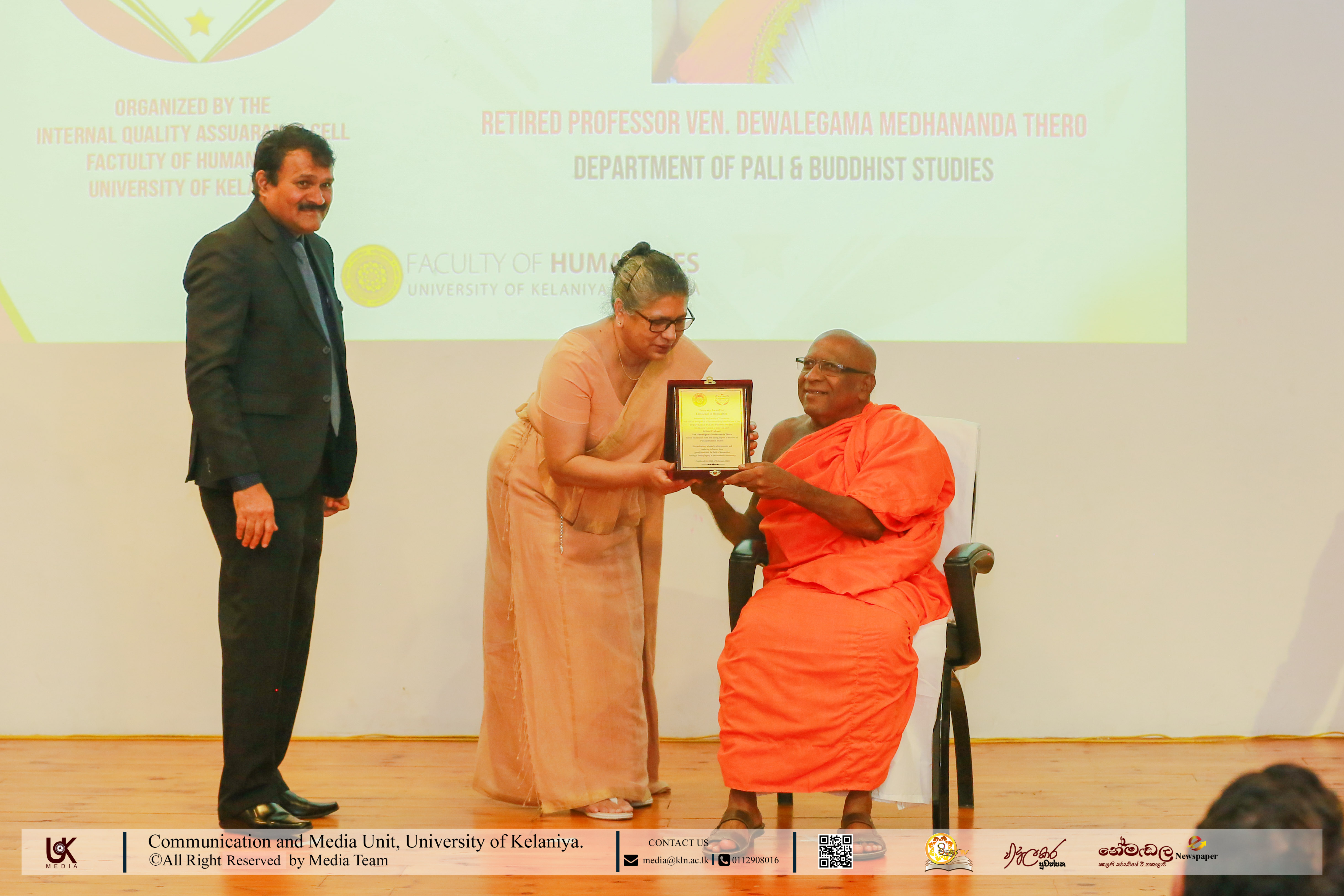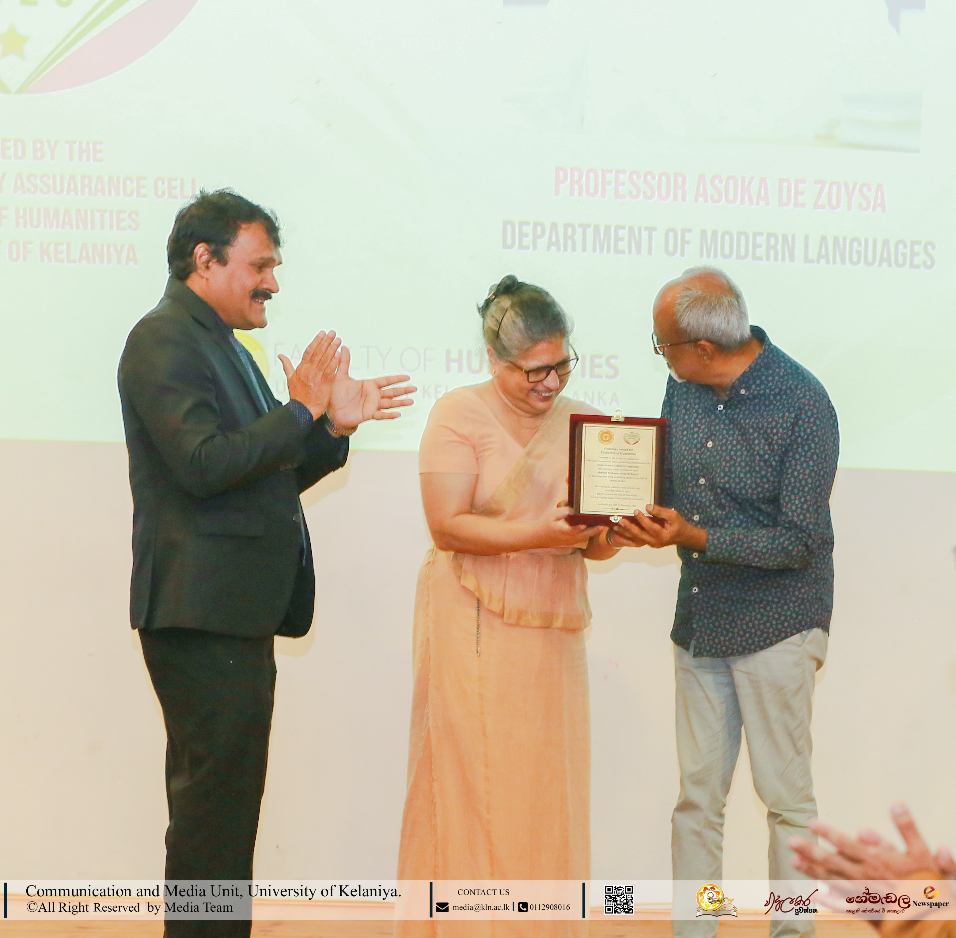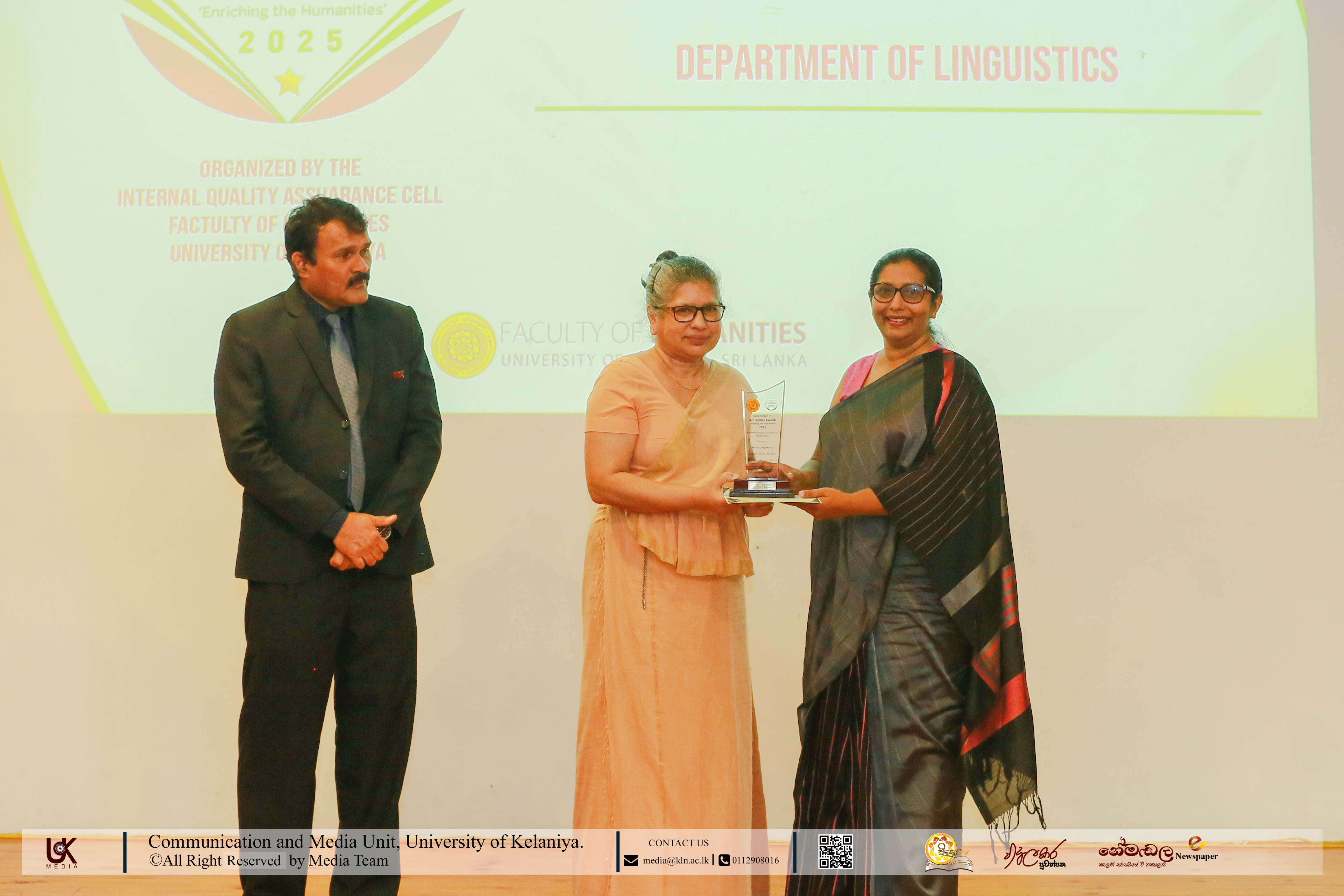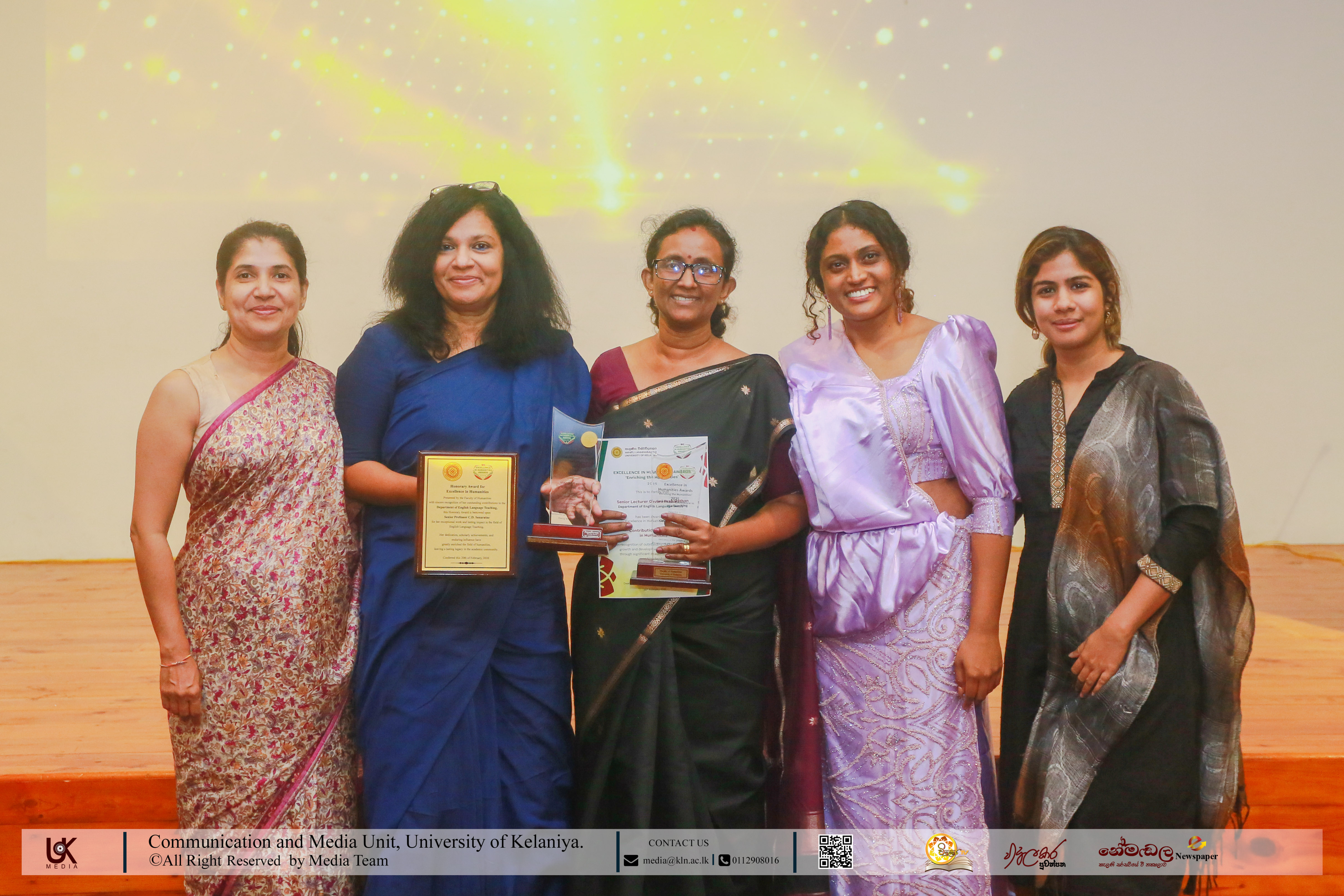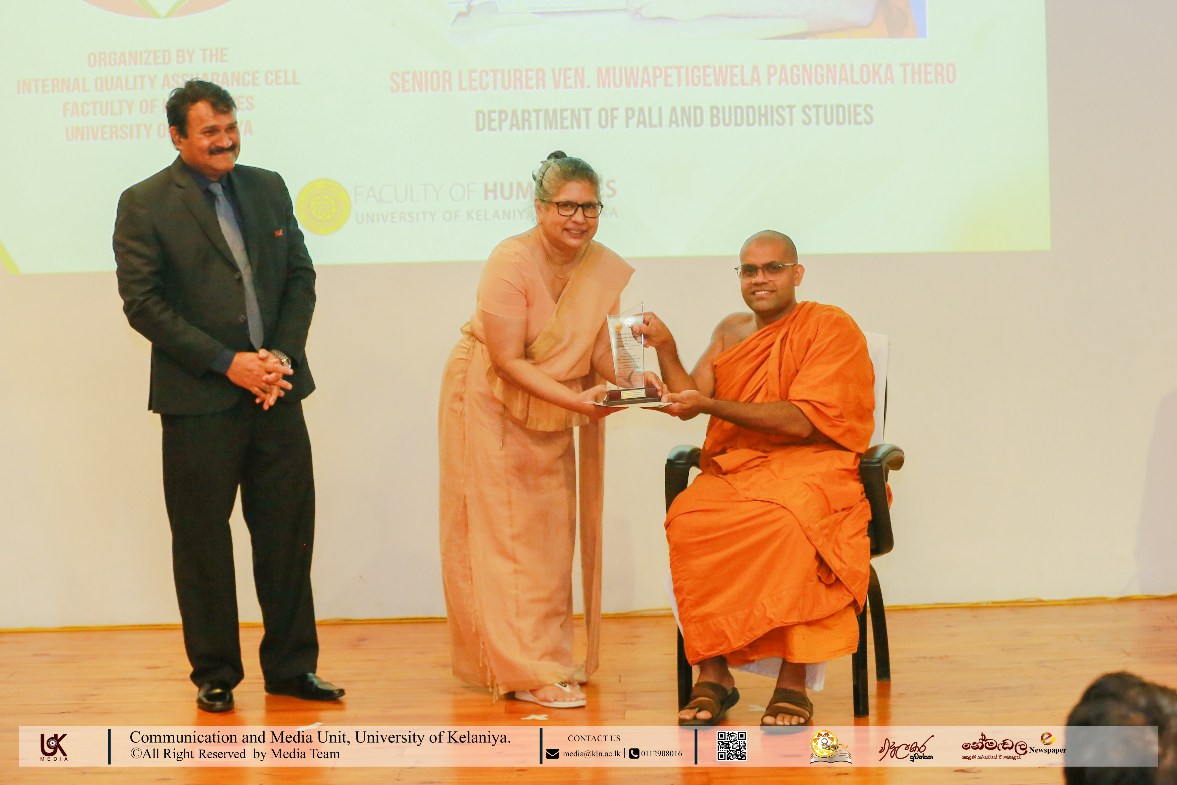 Under Contribution Excellence in Humanities, awards were presented to Ven. Dr Dewagoda Piyarathana Thero, Department of Sanskrit & Eastern Studies; Senior Lecturer Gevani Prahalathan, Department of English Language Teaching; Senior Lecturer Sulochana Rathnayake, Department of Modern Languages; Senior Lecturer Ven. Muwapetigewela Pagngnaloka Thero, Department of Pali and Buddhist Studies, Senior Lecturer B. B. M. Jayasundara, Department of Sinhala; Senior Lecturer Hasara Dasuni Hirimuthugoda, Department of Hindi Studies; Senior Lecturer Jayamal de Silva, Department of Linguistics; and Dr R. M. S. Priyadarshani, Education Unit.