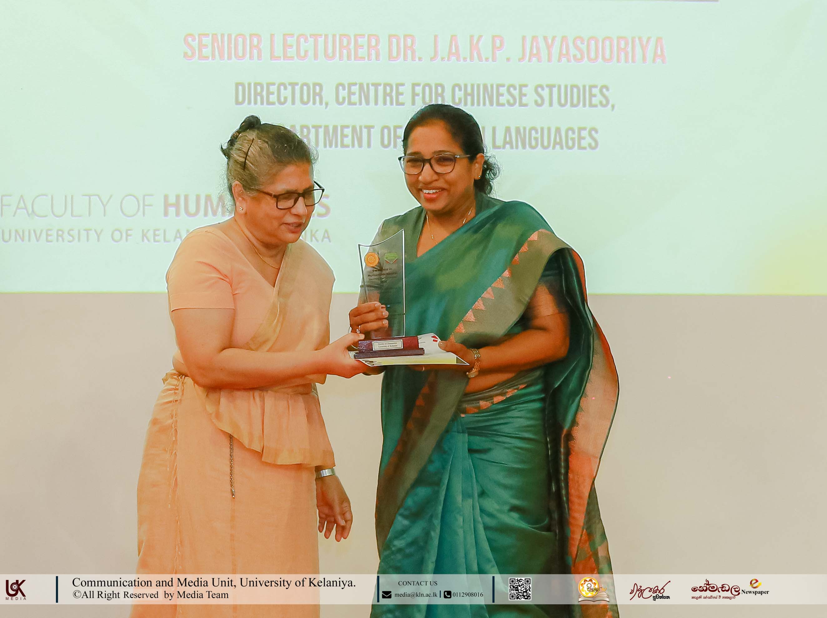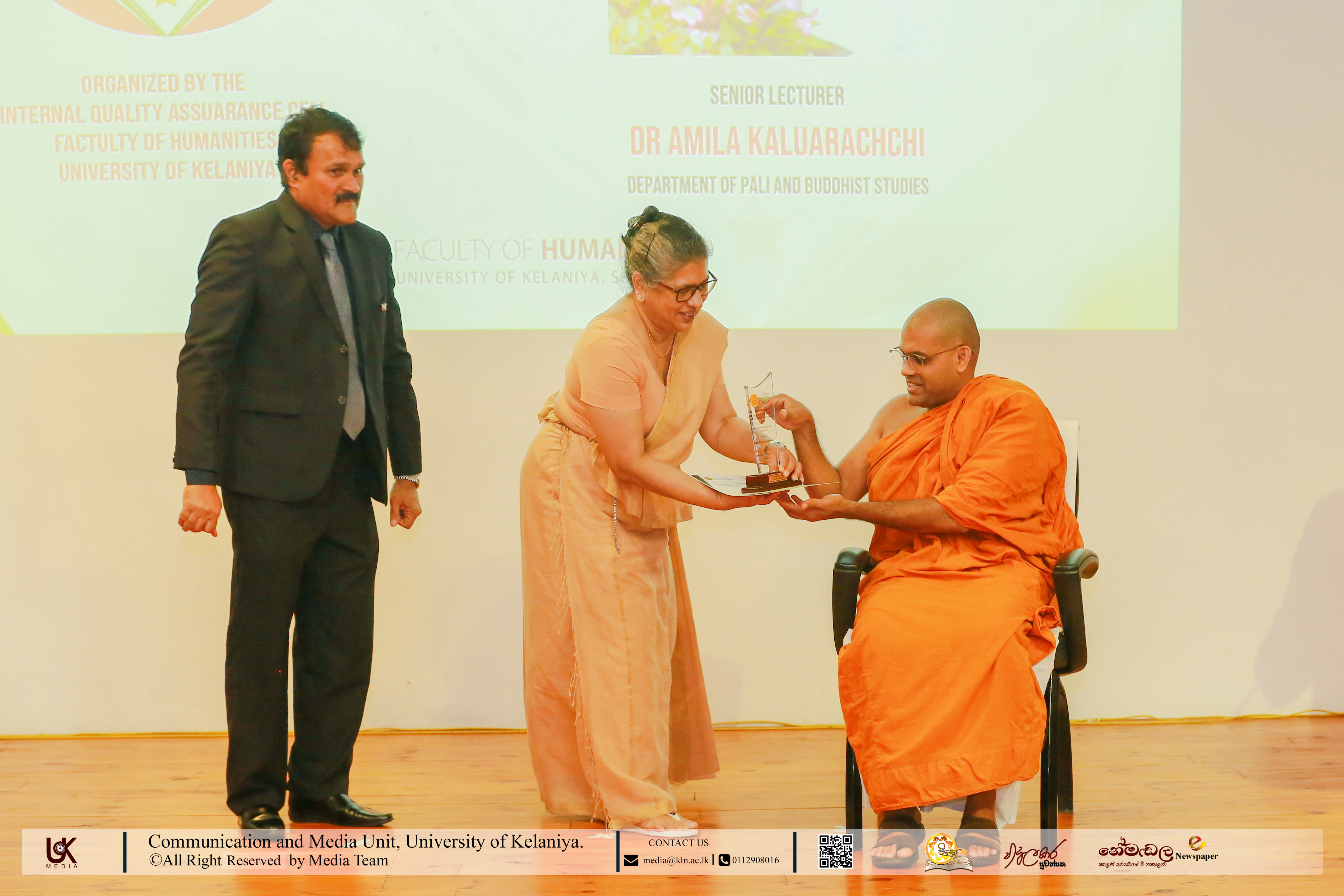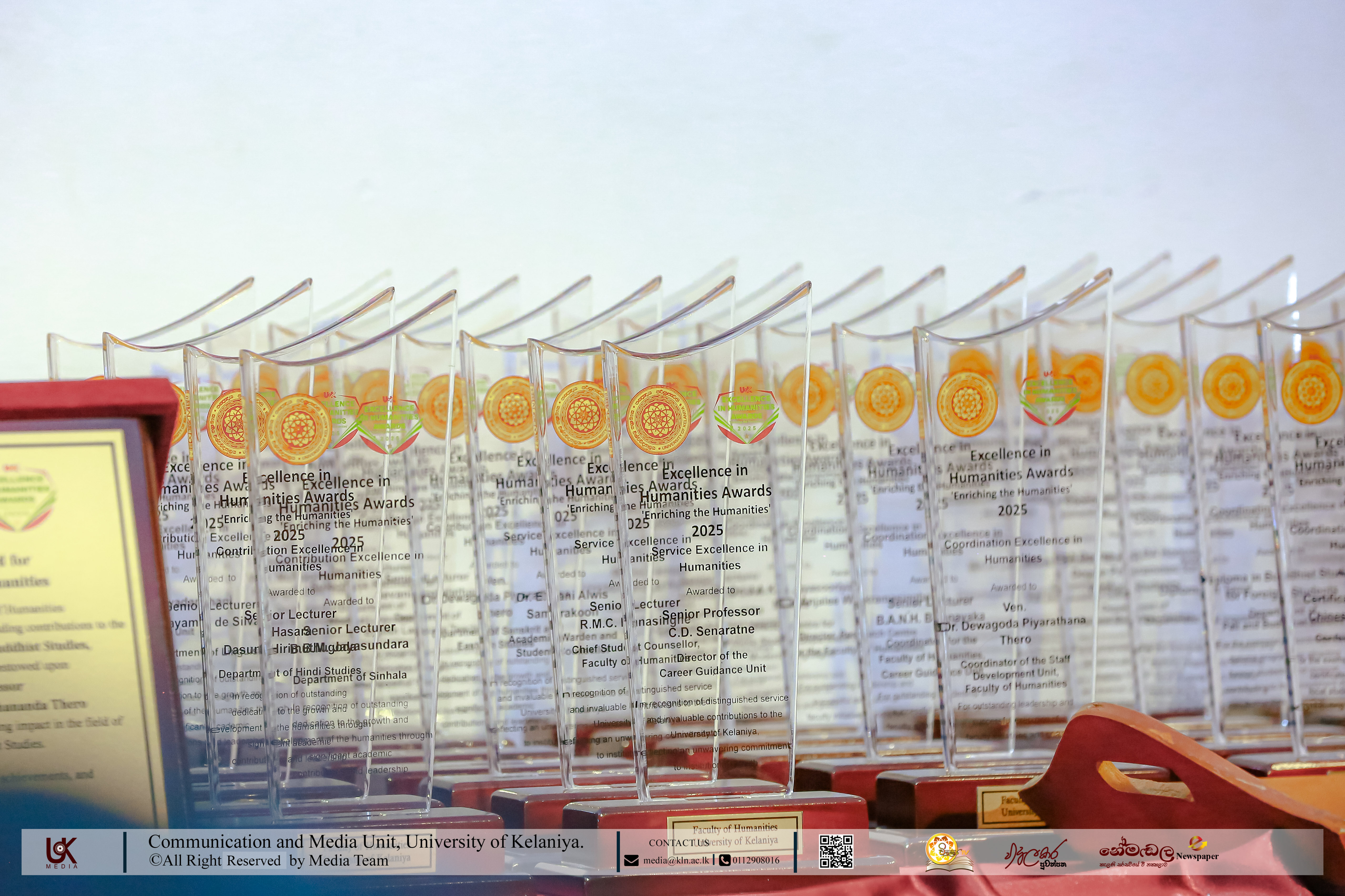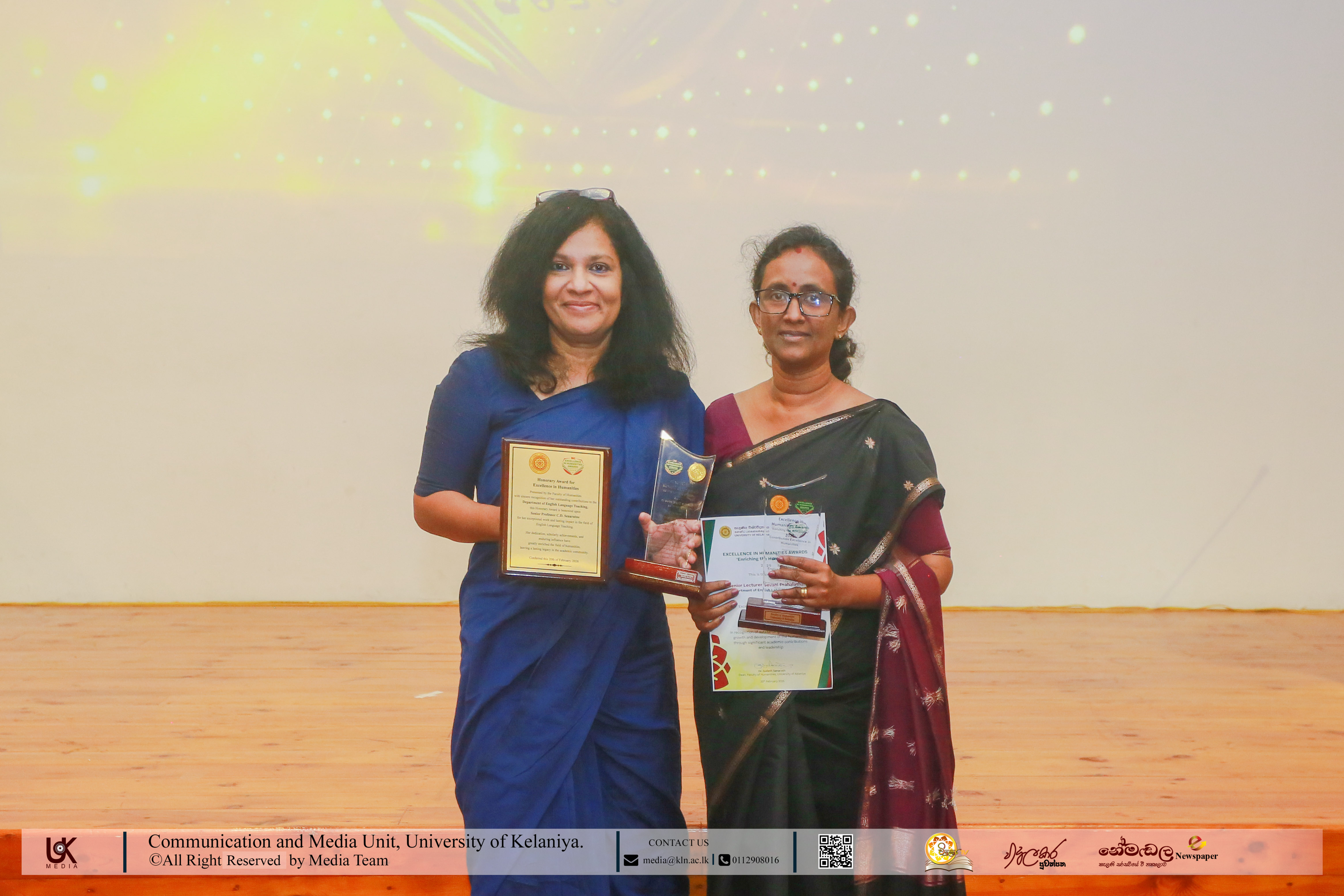 Under Contribution Excellence in Humanities, awards were presented to Ven. Dr Dewagoda Piyarathana Thero, Department of Sanskrit & Eastern Studies; Senior Lecturer Gevani Prahalathan, Department of English Language Teaching; Senior Lecturer Sulochana Rathnayake, Department of Modern Languages; Senior Lecturer Ven. Muwapetigewela Pagngnaloka Thero, Department of Pali and Buddhist Studies, Senior Lecturer B. B. M. Jayasundara, Department of Sinhala; Senior Lecturer Hasara Dasuni Hirimuthugoda, Department of Hindi Studies; Senior Lecturer Jayamal de Silva, Department of Linguistics; and Dr R. M. S. Priyadarshani, Education Unit.
