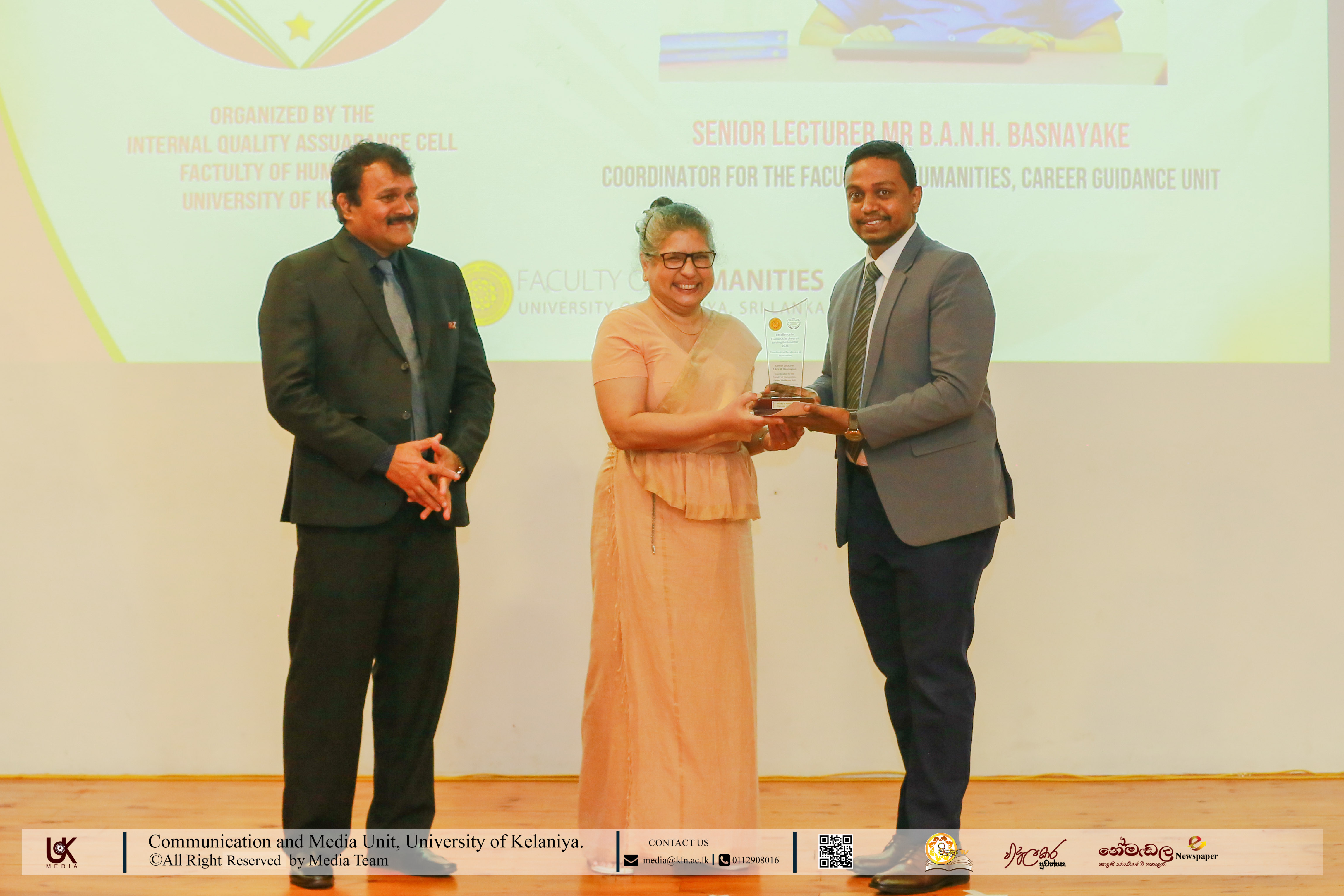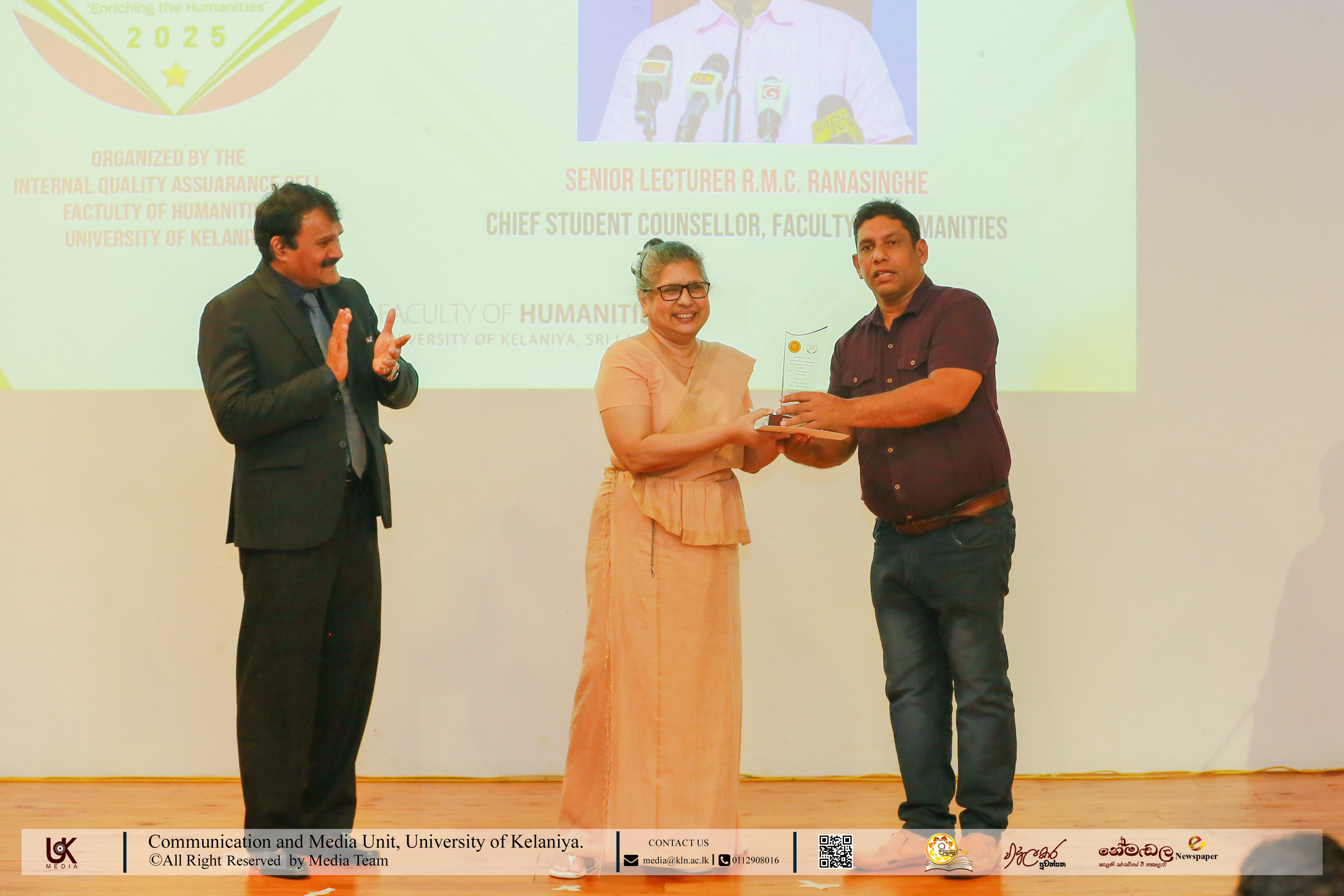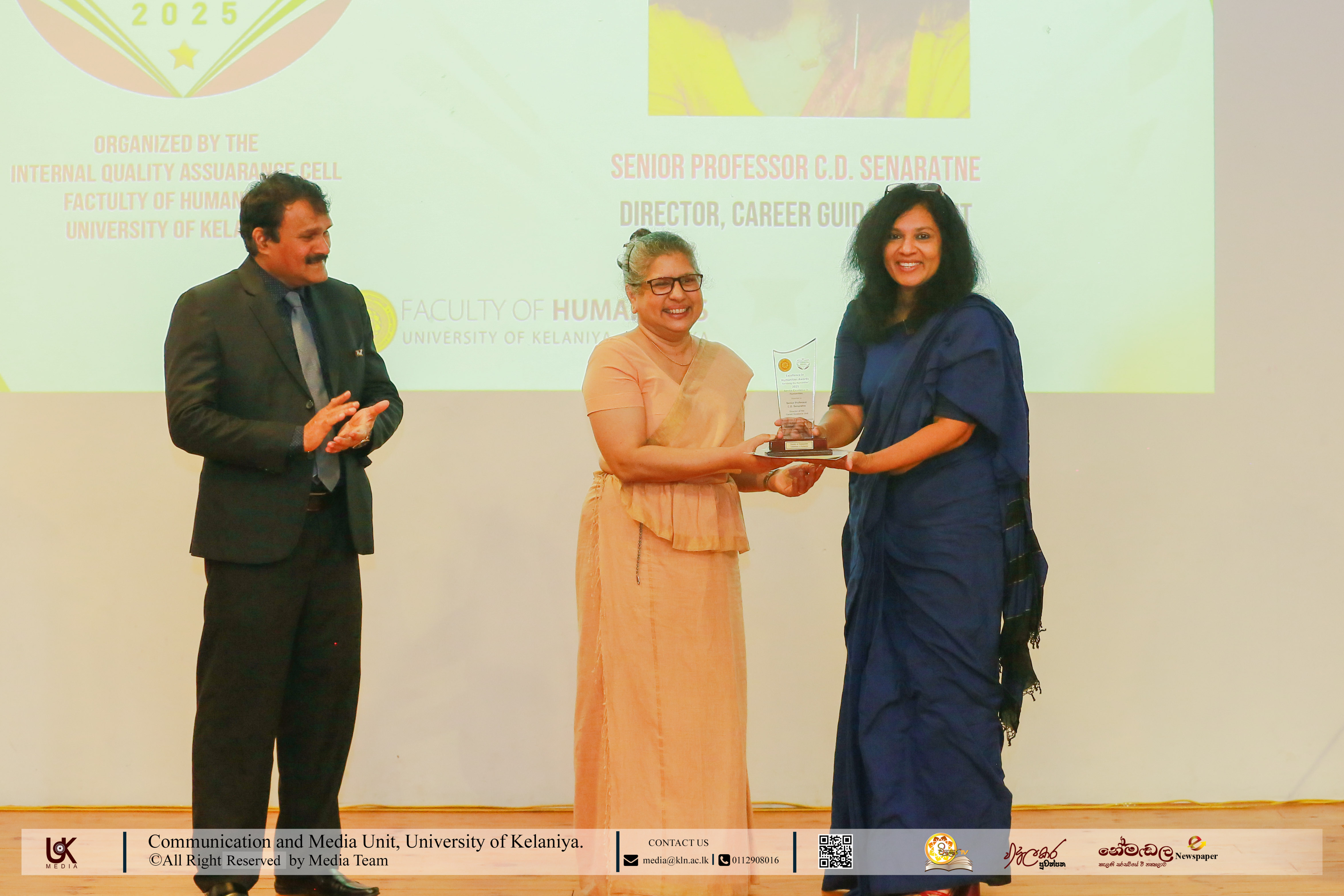 The Service Excellence in Humanities awards honoured Senior Professor C. D. Senaratne, Director, Career Guidance Unit; Dr E. Jani Alwis Samarakoon, Academic Warden & Student Counsellor; and Senior Lecturer R. M. C. Ranasinghe, Chief Student Counsellor, Faculty of Humanities.