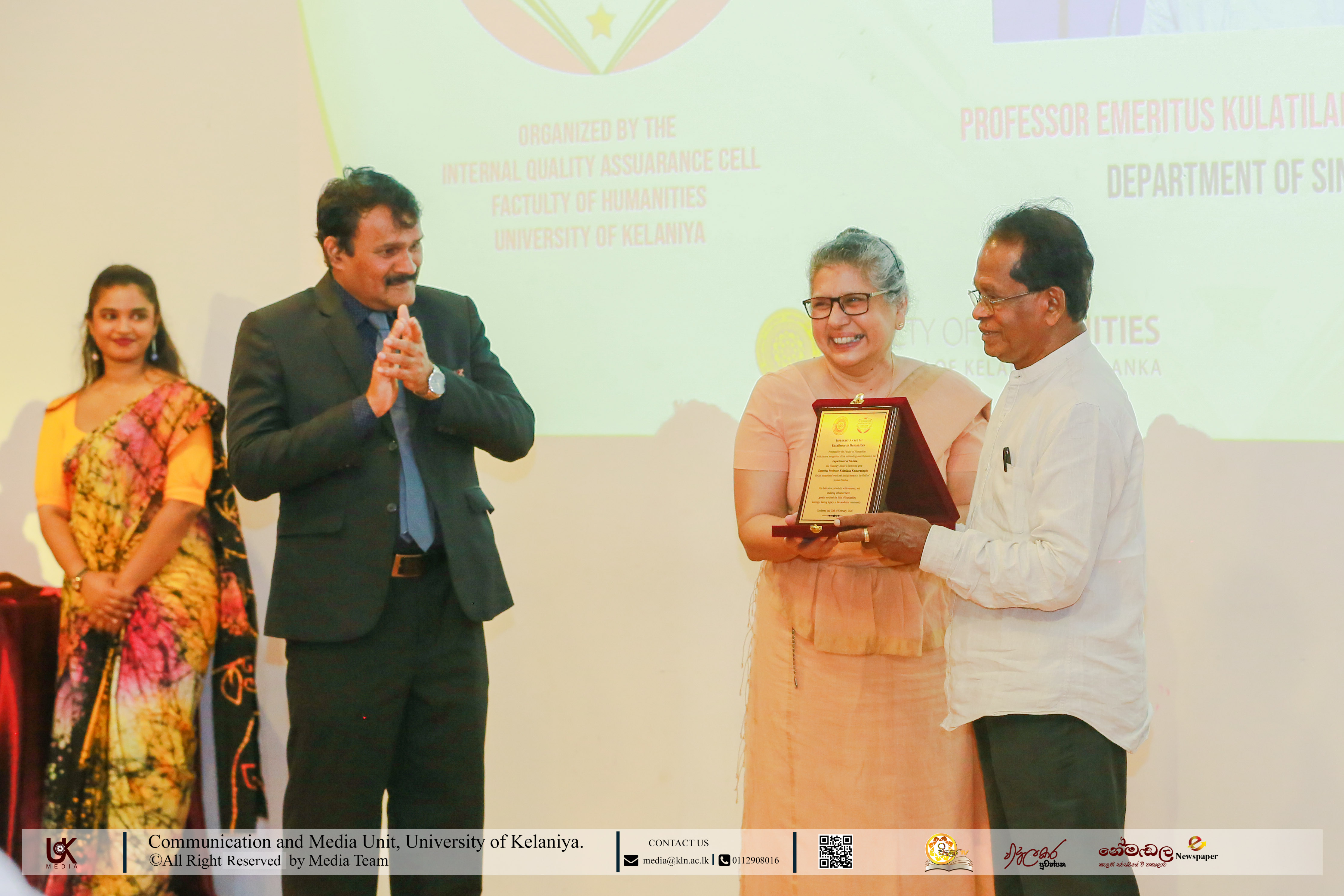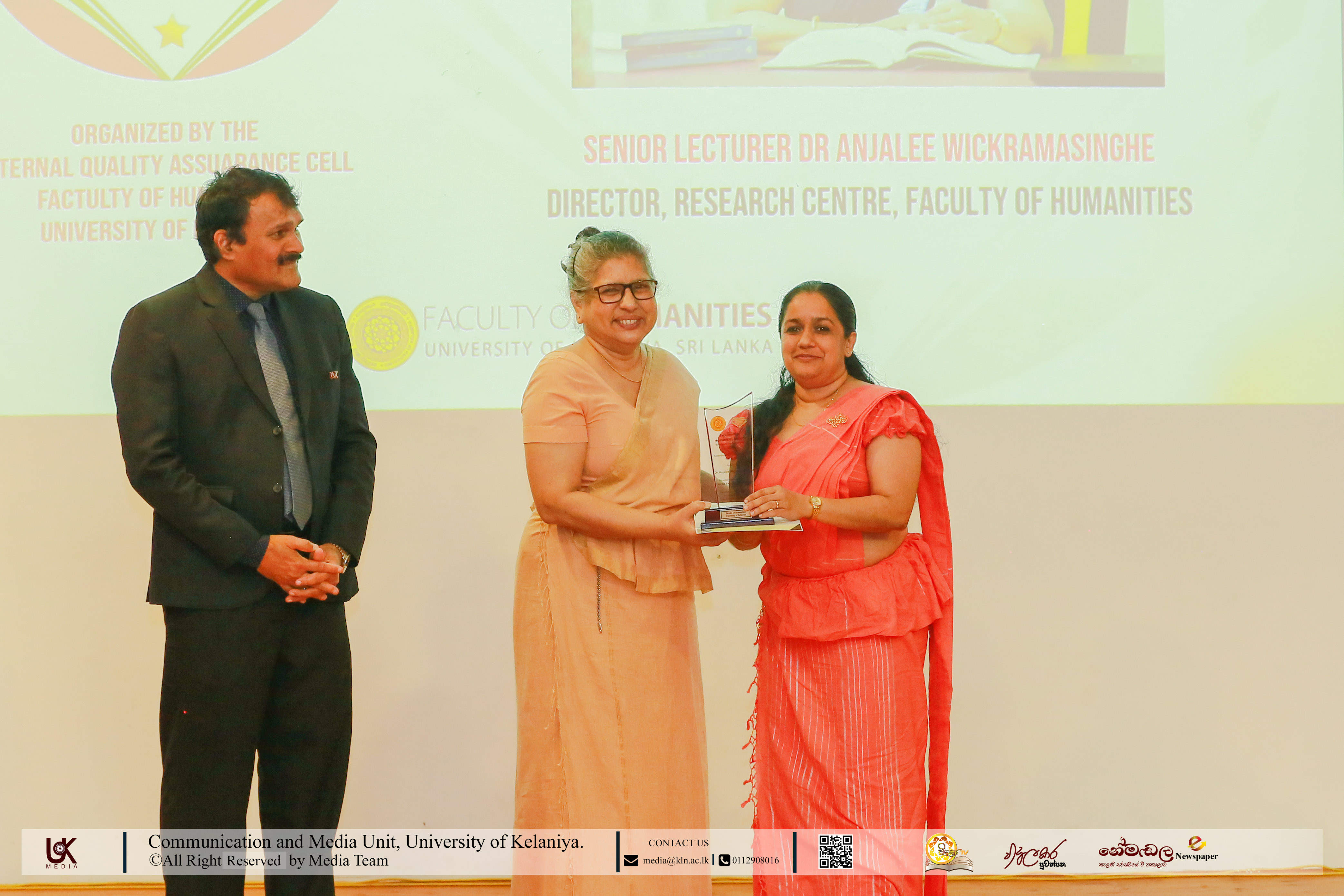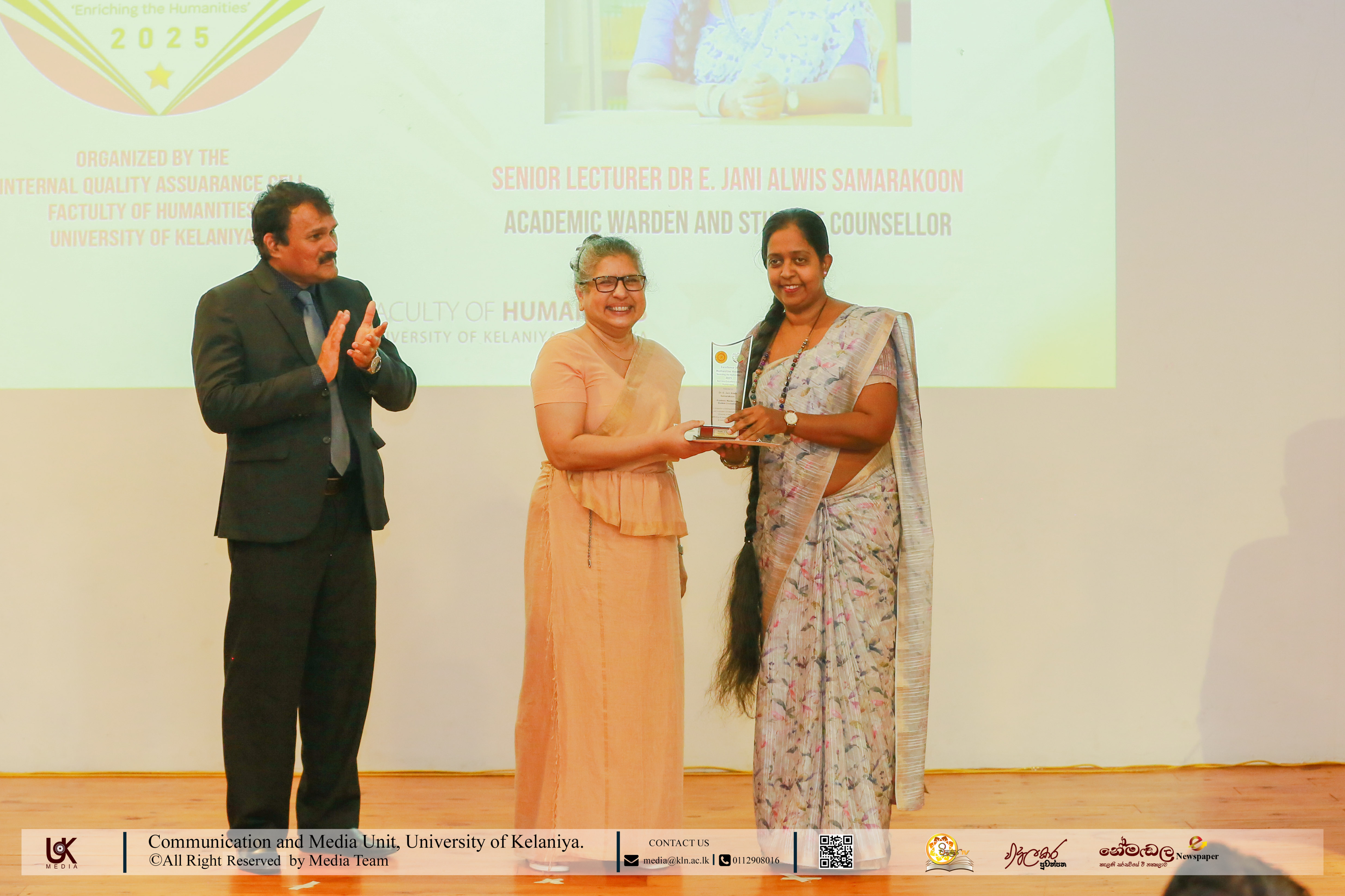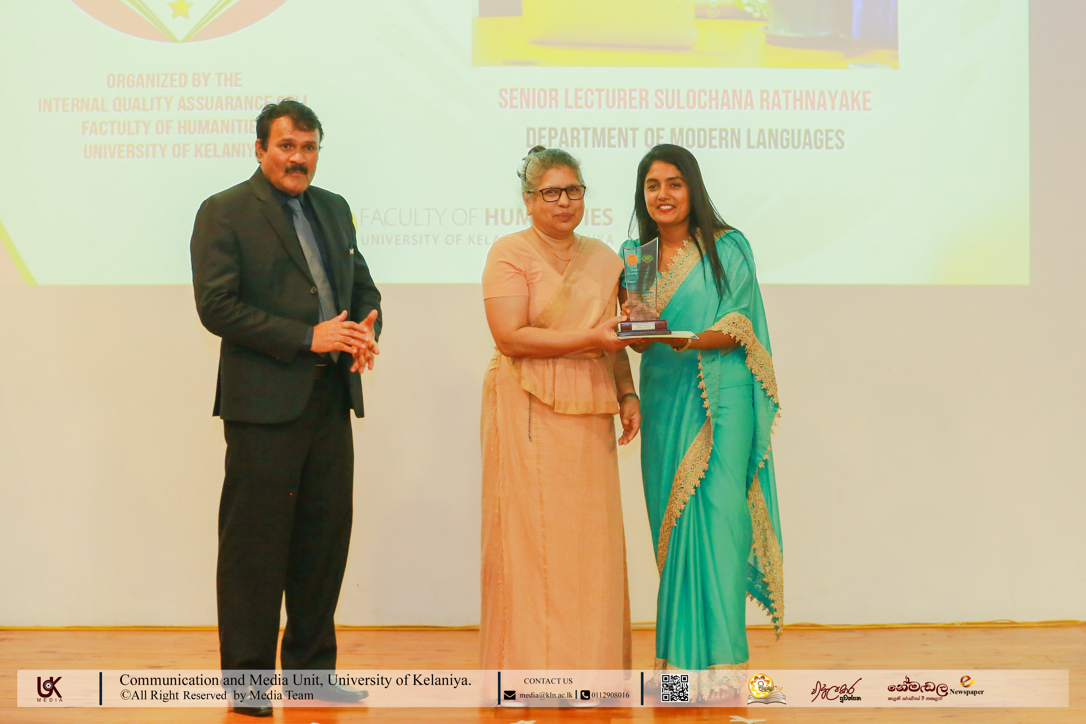 The Service Excellence in Humanities awards honoured Senior Professor C. D. Senaratne, Director, Career Guidance Unit; Dr E. Jani Alwis Samarakoon, Academic Warden & Student Counsellor; and Senior Lecturer R. M. C. Ranasinghe, Chief Student Counsellor, Faculty of Humanities.