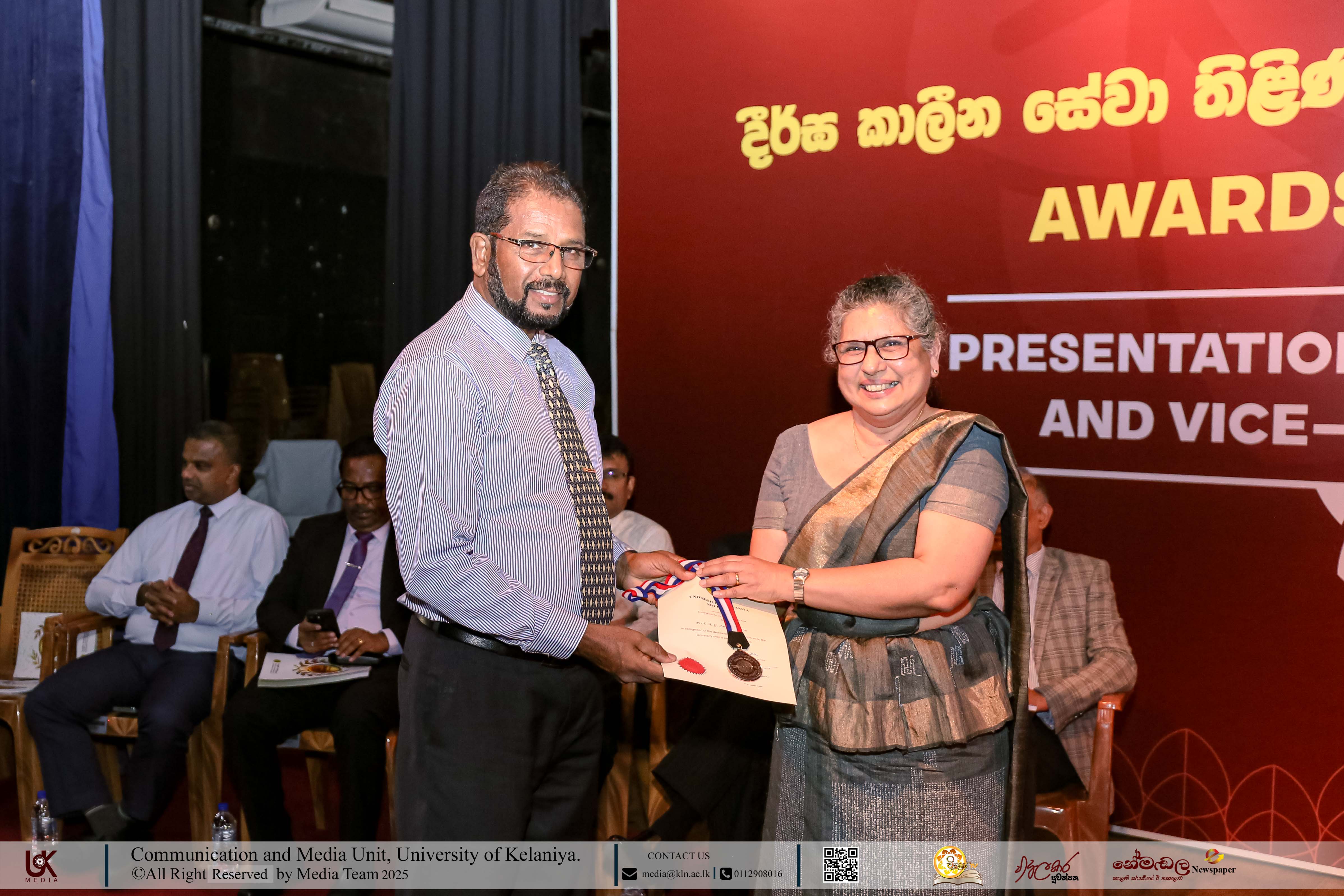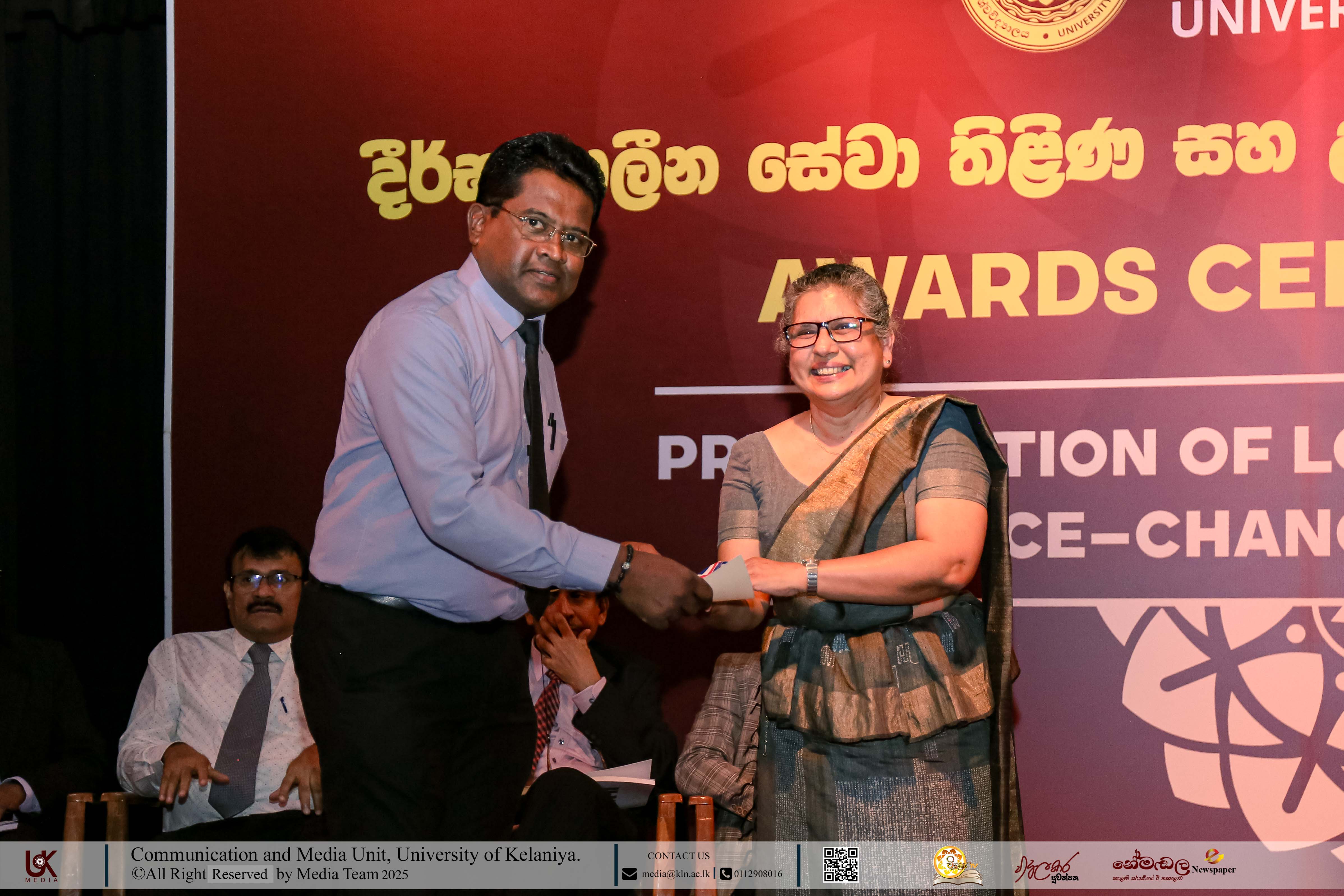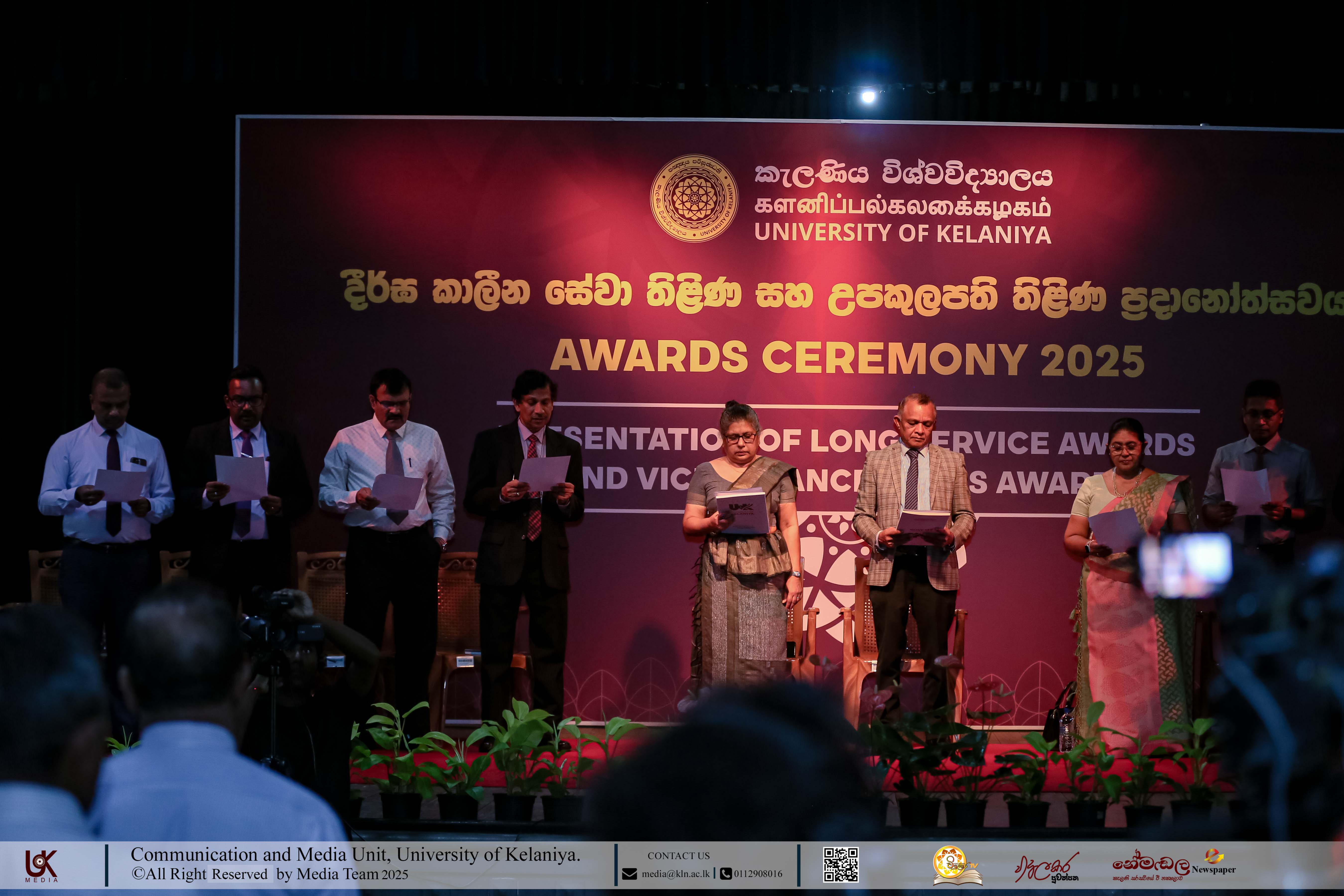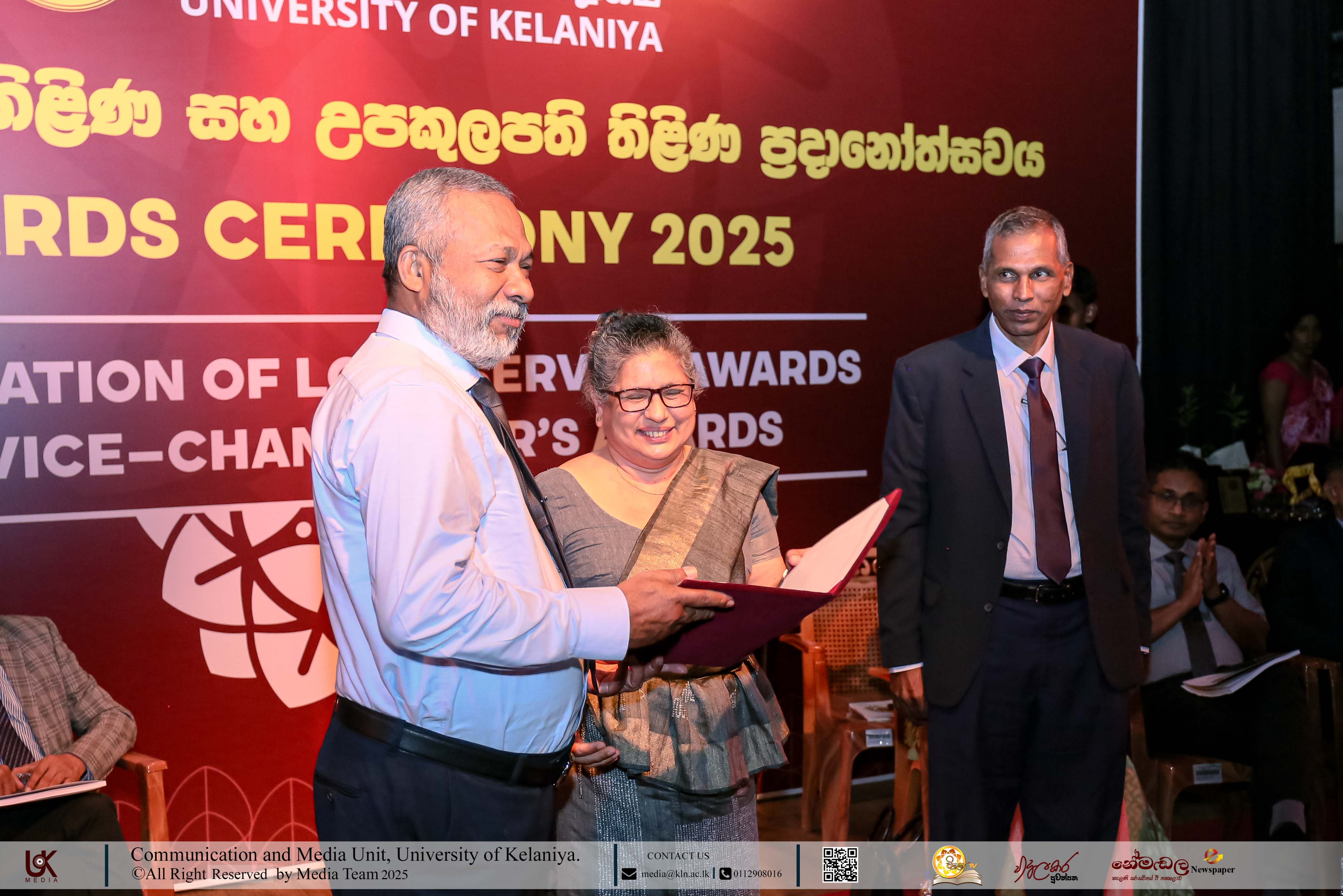 Mr D. M. N. Bandara, Chief Security Officer, University of Kelaniya; Ms D. B. W. P. Savindhi, Technical Officer (Grade I) ICT Center; Mr T. G. D. Samanthilaka, Technical Officer (Grade I), ICT Center; Mr A. T. Kannangara, Technical Officer (Grade I), Department of Chemistry, Faculty of Science; Mr S. A. A. K. Sooriyaarachchi, Technical Officer (Grade I), Department of Chemistry, Faculty of Science; Mr W. M. J. M. Welagedara, Technical Officer (ICT) (Grade III), Department of Mathematics, Faculty of Science; Ms M. B. Soolangaarachchige, Technical Officer (ICT) (Grade III), Examination Unit, Faculty of Medicine; Ms J. A. P. Madhushani, Technical Officer (ICT) (Grade III), Faculty of Medicine; and Mr H. P. N. Karunathilaka, Laboratory Attendant (Grade II), ICT Center received Gold Medals and certificates under the category, Vice-chancellor’s Awards for Executive Officers, Academic Support Staff and Non-academic Staff in 2025.