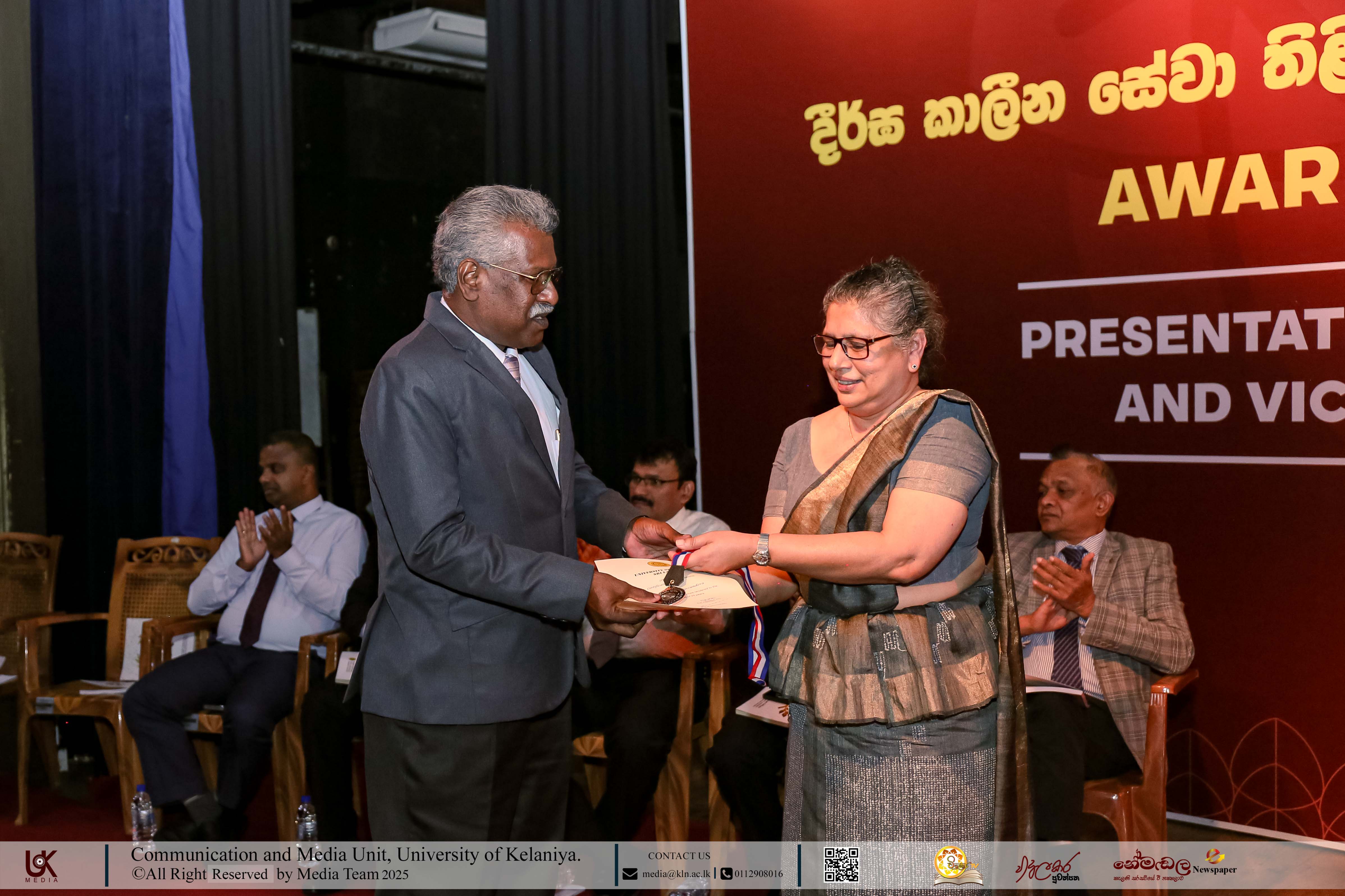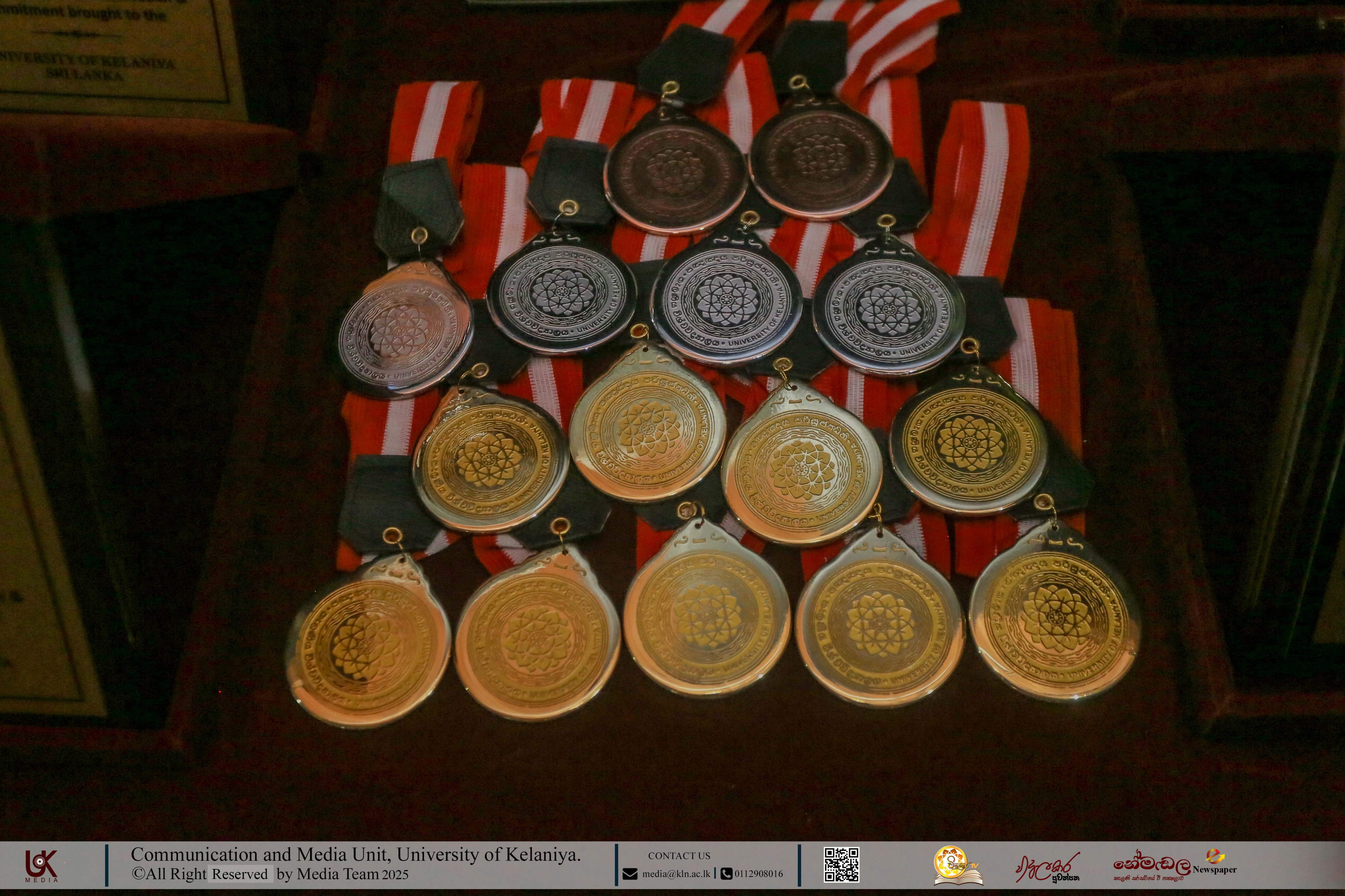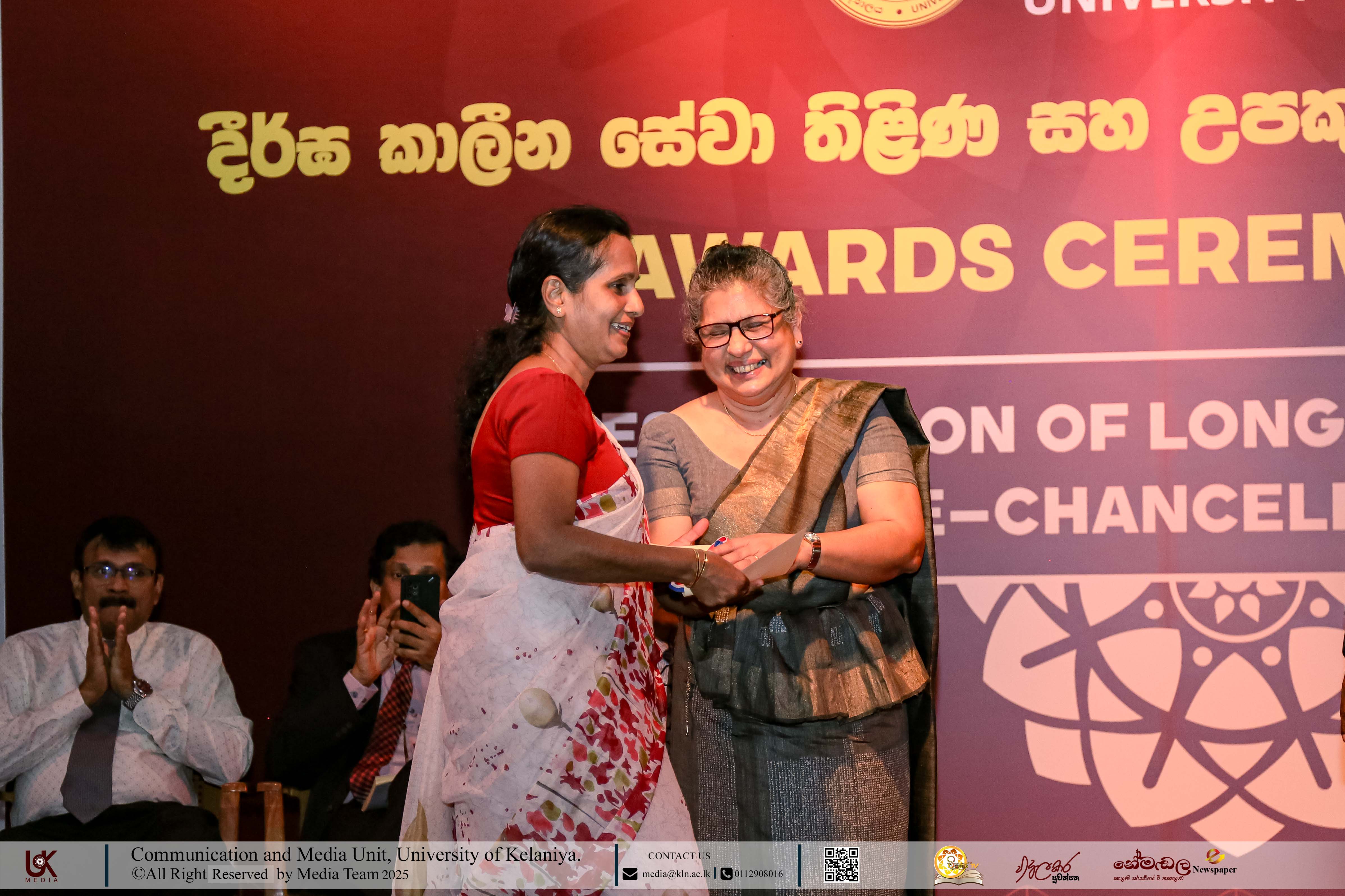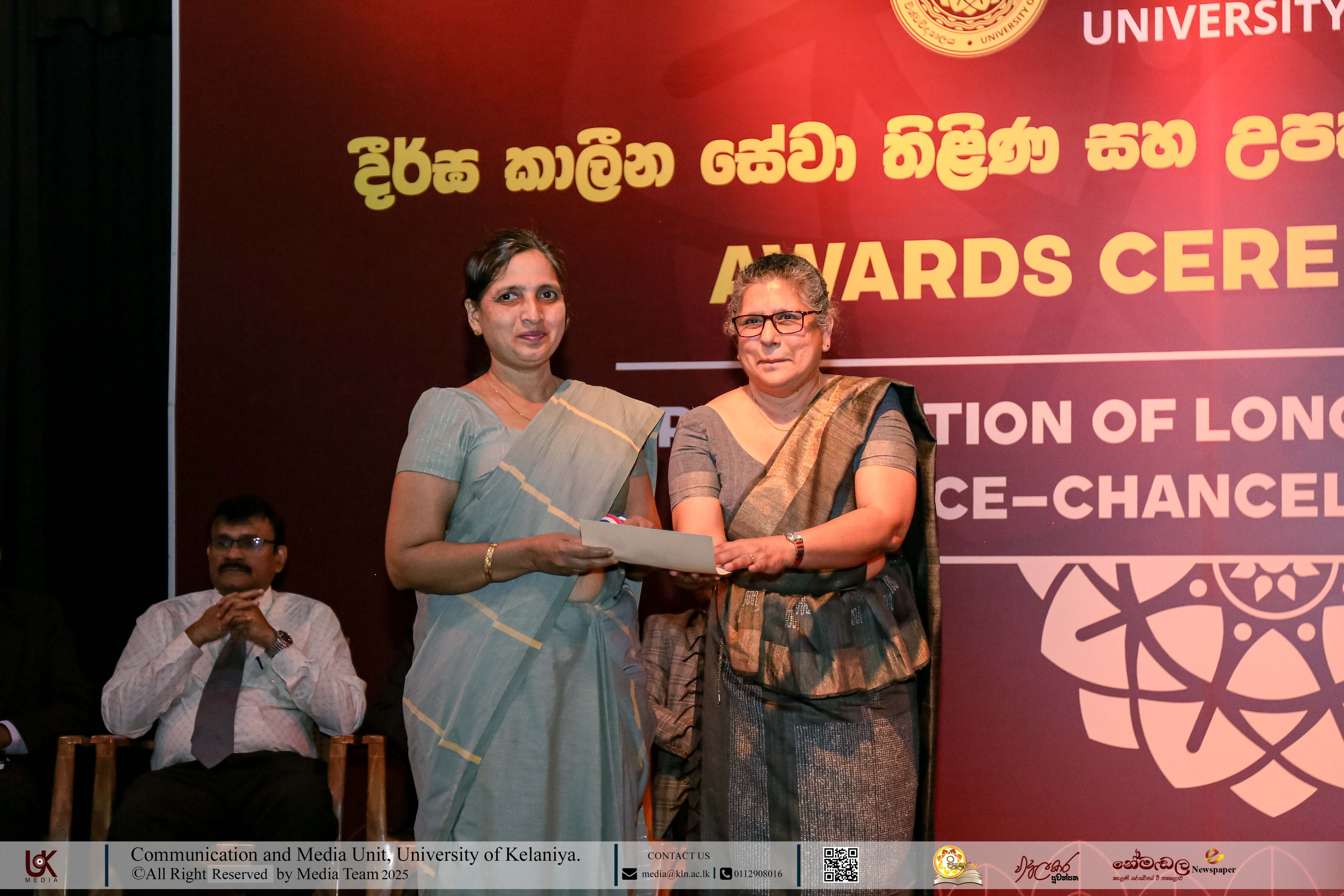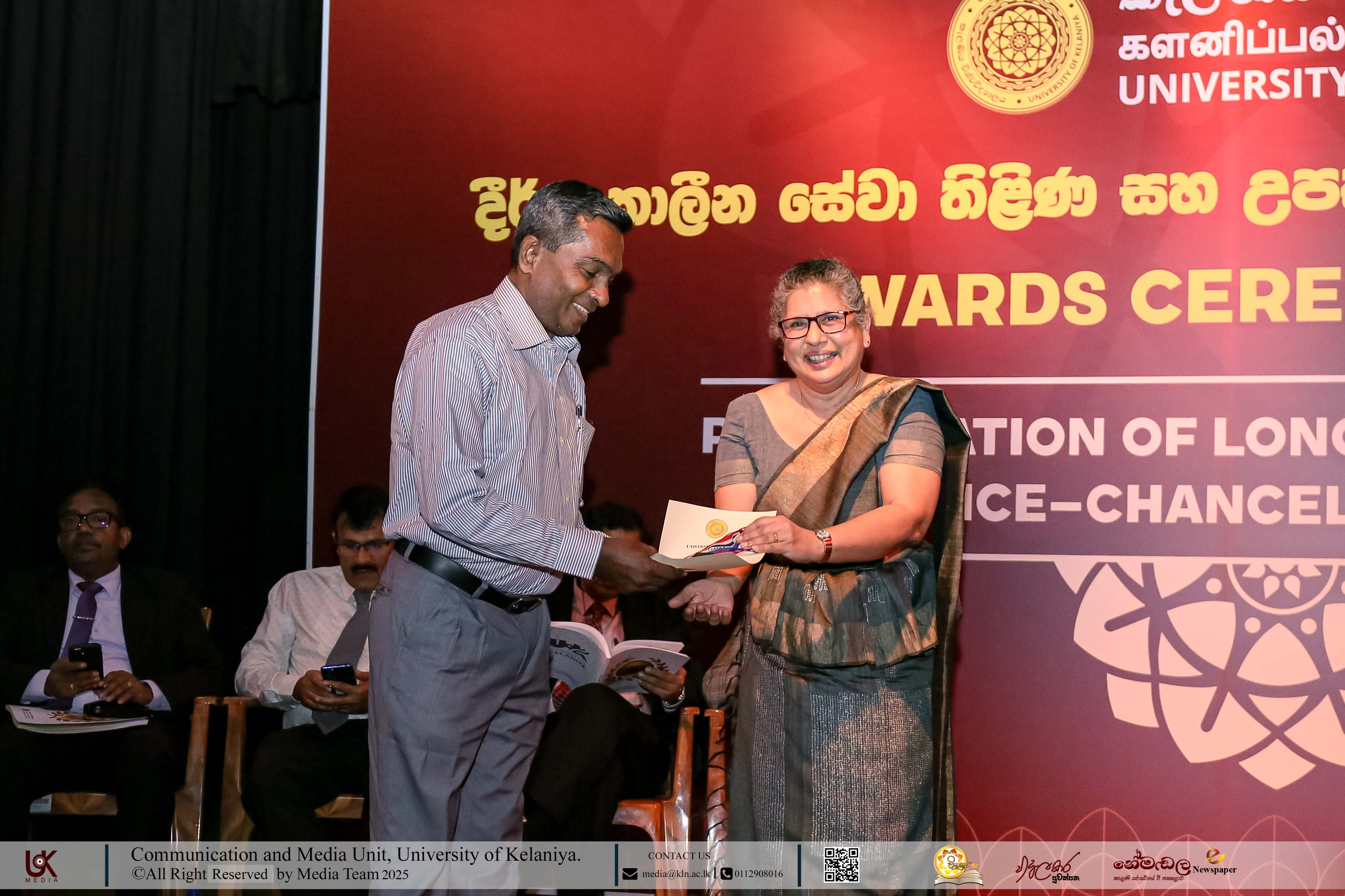 Mr D. M. N. Bandara, Chief Security Officer, University of Kelaniya; Ms D. B. W. P. Savindhi, Technical Officer (Grade I) ICT Center; Mr T. G. D. Samanthilaka, Technical Officer (Grade I), ICT Center; Mr A. T. Kannangara, Technical Officer (Grade I), Department of Chemistry, Faculty of Science; Mr S. A. A. K. Sooriyaarachchi, Technical Officer (Grade I), Department of Chemistry, Faculty of Science; Mr W. M. J. M. Welagedara, Technical Officer (ICT) (Grade III), Department of Mathematics, Faculty of Science; Ms M. B. Soolangaarachchige, Technical Officer (ICT) (Grade III), Examination Unit, Faculty of Medicine; Ms J. A. P. Madhushani, Technical Officer (ICT) (Grade III), Faculty of Medicine; and Mr H. P. N. Karunathilaka, Laboratory Attendant (Grade II), ICT Center received Gold Medals and certificates under the category, Vice-chancellor’s Awards for Executive Officers, Academic Support Staff and Non-academic Staff in 2025.