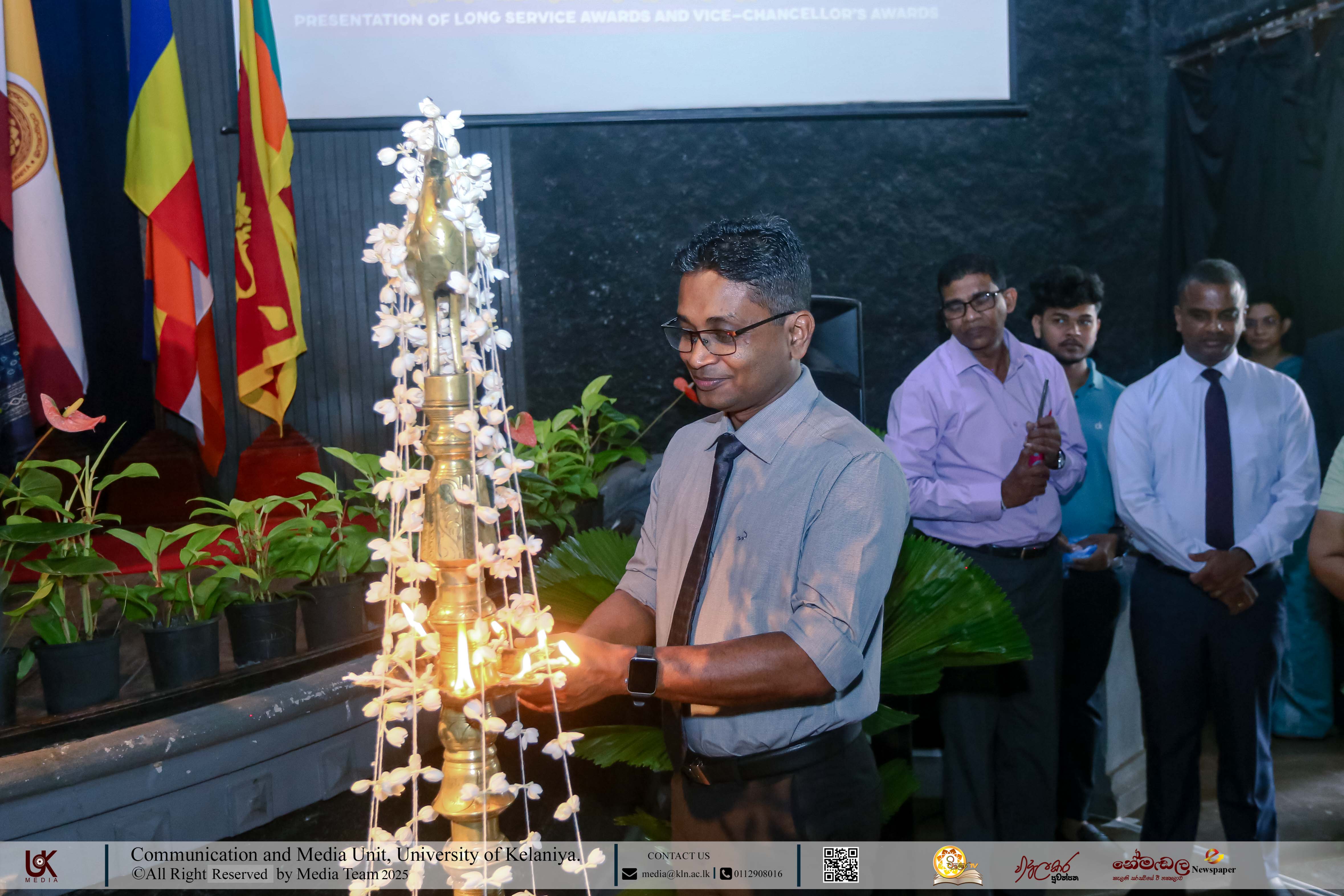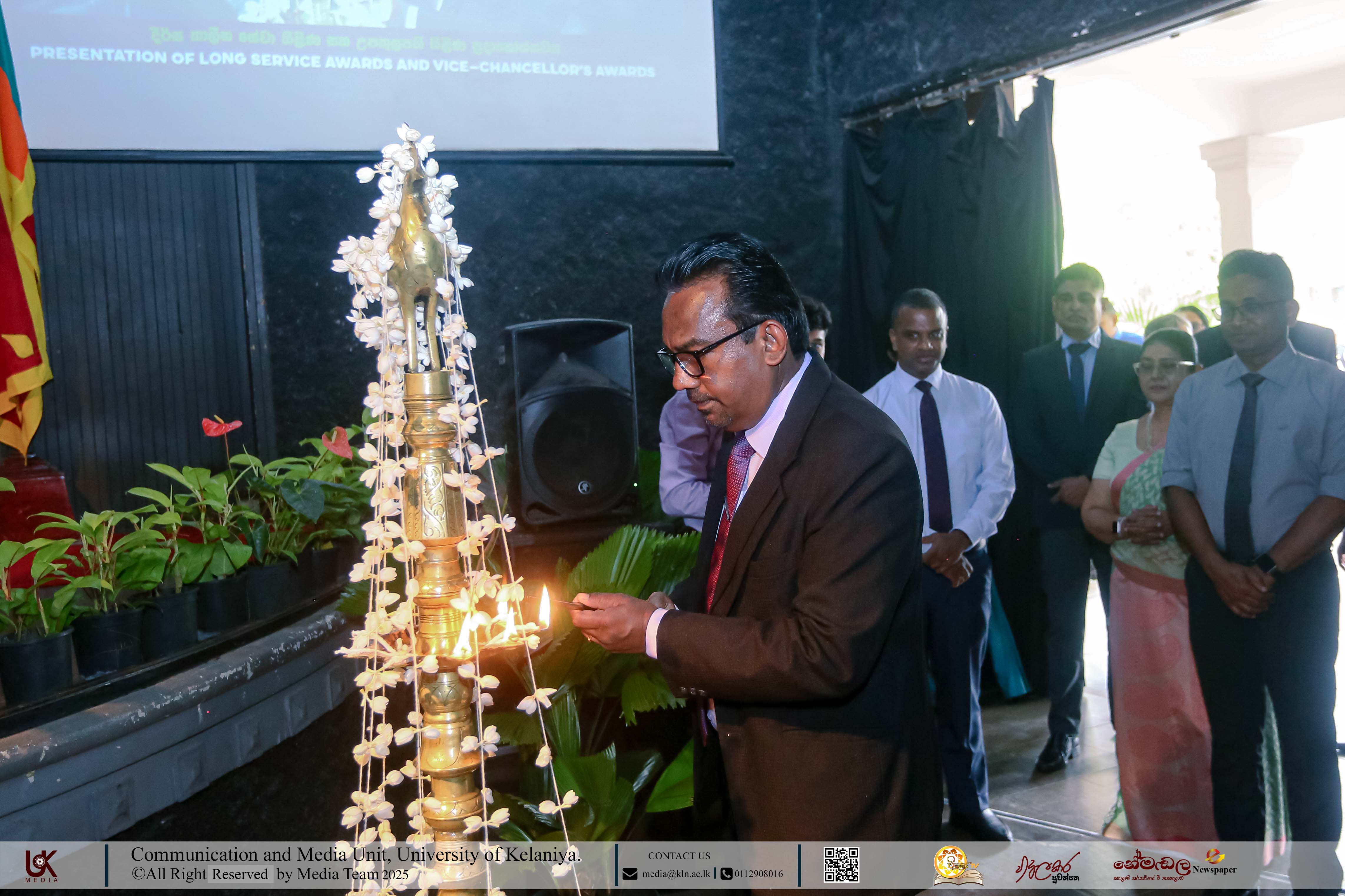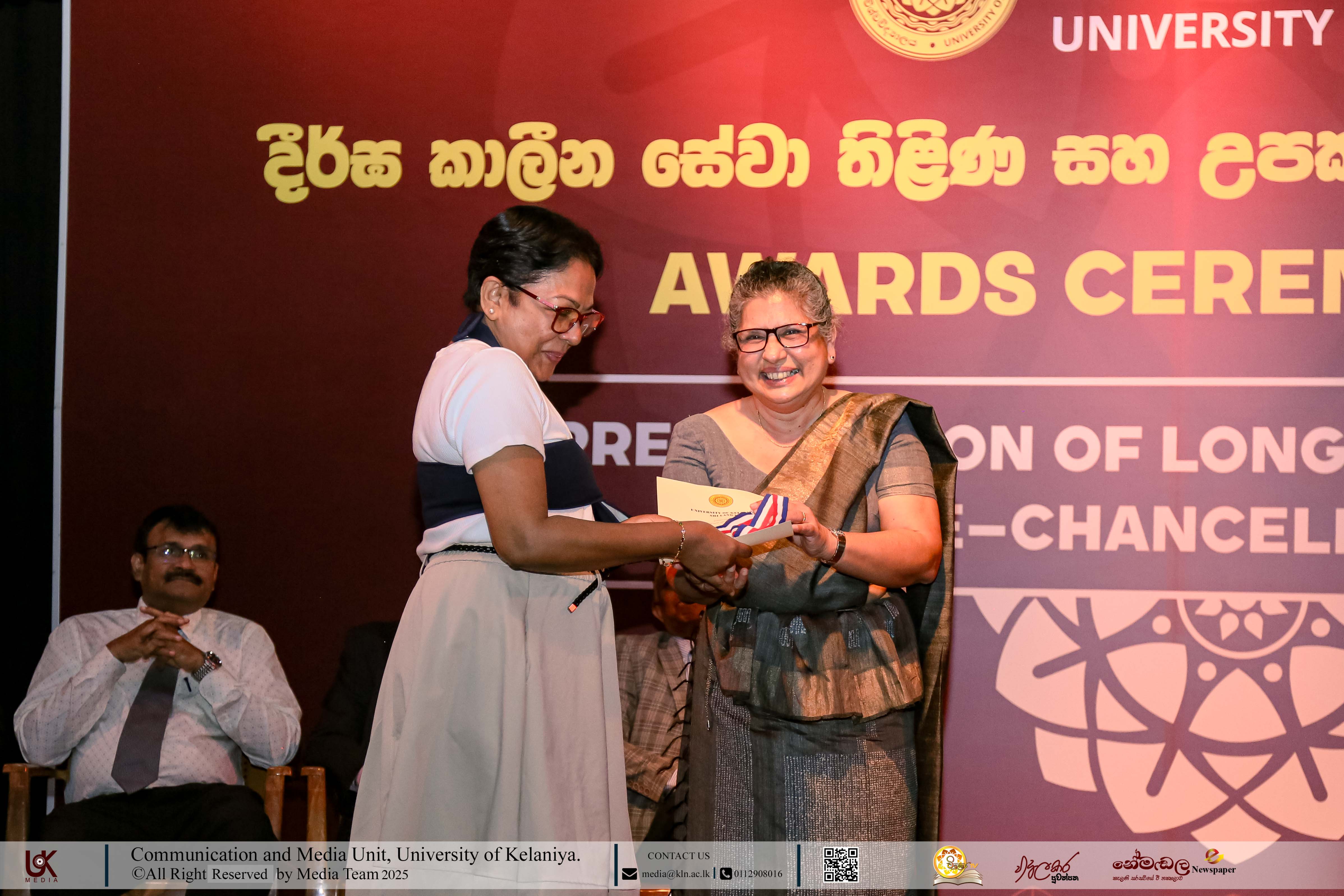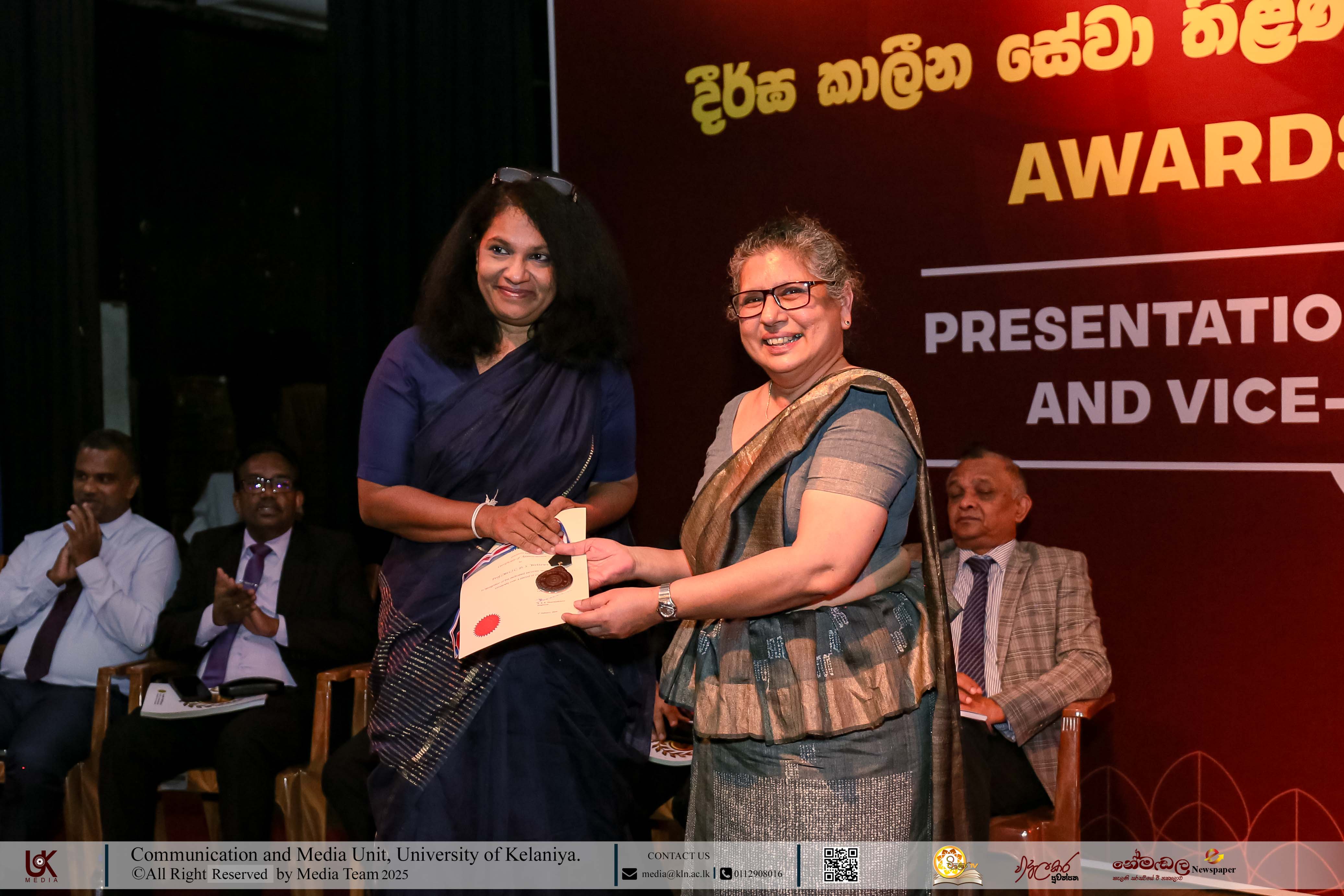Mr D. M. N. Bandara, Chief Security Officer, University of Kelaniya; Ms D. B. W. P. Savindhi, Technical Officer (Grade I) ICT Center; Mr T. G. D. Samanthilaka, Technical Officer (Grade I), ICT Center; Mr A. T. Kannangara, Technical Officer (Grade I), Department of Chemistry, Faculty of Science; Mr S. A. A. K. Sooriyaarachchi, Technical Officer (Grade I), Department of Chemistry, Faculty of Science; Mr W. M. J. M. Welagedara, Technical Officer (ICT) (Grade III), Department of Mathematics, Faculty of Science; Ms M. B. Soolangaarachchige, Technical Officer (ICT) (Grade III), Examination Unit, Faculty of Medicine; Ms J. A. P. Madhushani, Technical Officer (ICT) (Grade III), Faculty of Medicine; and Mr H. P. N. Karunathilaka, Laboratory Attendant (Grade II), ICT Center received Gold Medals and certificates under the category, Vice-chancellor’s Awards for Executive Officers, Academic Support Staff and Non-academic Staff in 2025.