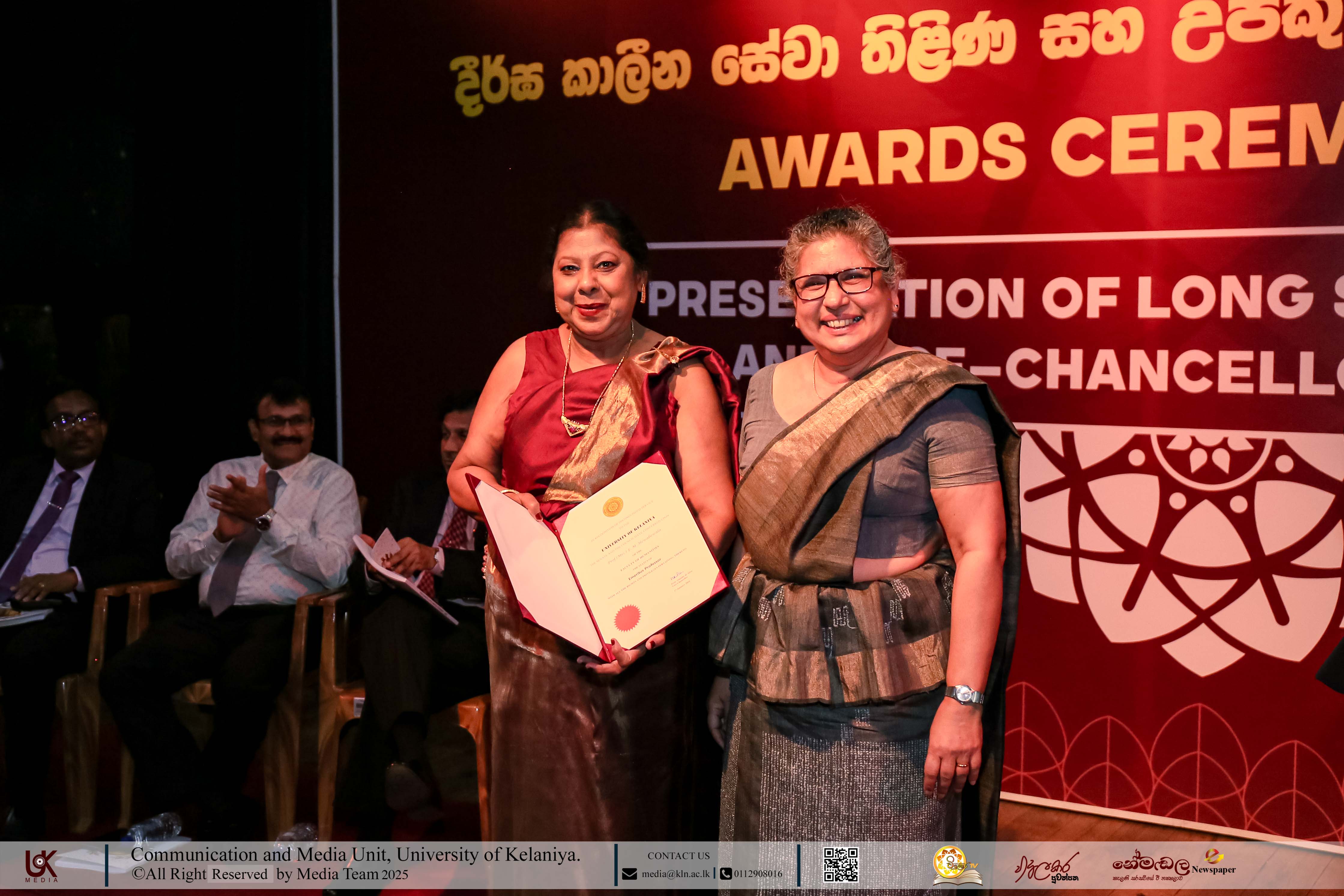Senior Professor C. D. S. Wettewe, Director of the Career Guidance Unit; Senior Professor P. A. S. Edirisinghe, Director of the Centre for Gender Studies; Dr C. W. Subasinghe, Director of the Centre for Sustainability Solutions; Dr H. A. K. S. Sanjeewani, Director of the Centre for Social Reconciliation; Senior Lecturer R. S. G. Rajapaksha, Director of the Communication & Media Unit; Dr S. A. C. L. Senarath, Director of the Staff Development Unit of the Faculty of Commerce & Management Studies (Coordinator); Dr J. A. C. B. Jayasinghe, Director of the Internship and Career Development Centre (FCMS); Dr G. H. B. A. de Silva, Director of the Digital Communications Centre; Dr. K. R. N. Harshani, Director of the Kalana Mithuru Sewana; and Dr R. R. L. U. I. Rajapaksha, Director of the Centre for the data Science & Artificial Inteligence (CDS-AI) received plaques and certificates under the commendations for Successful Directors of the Centers/ Units in 2025.