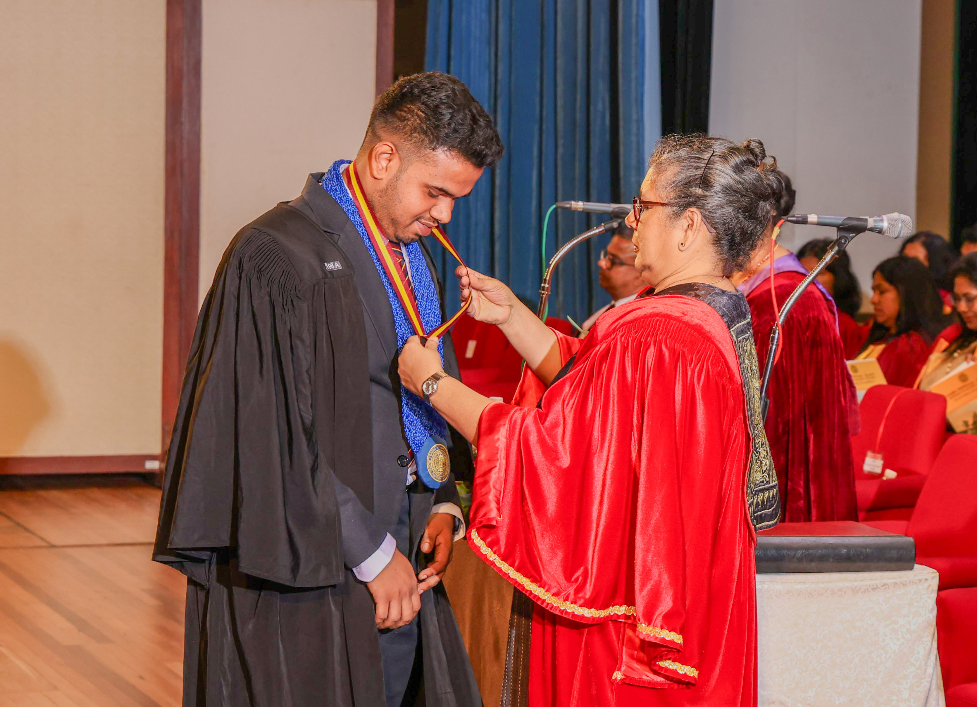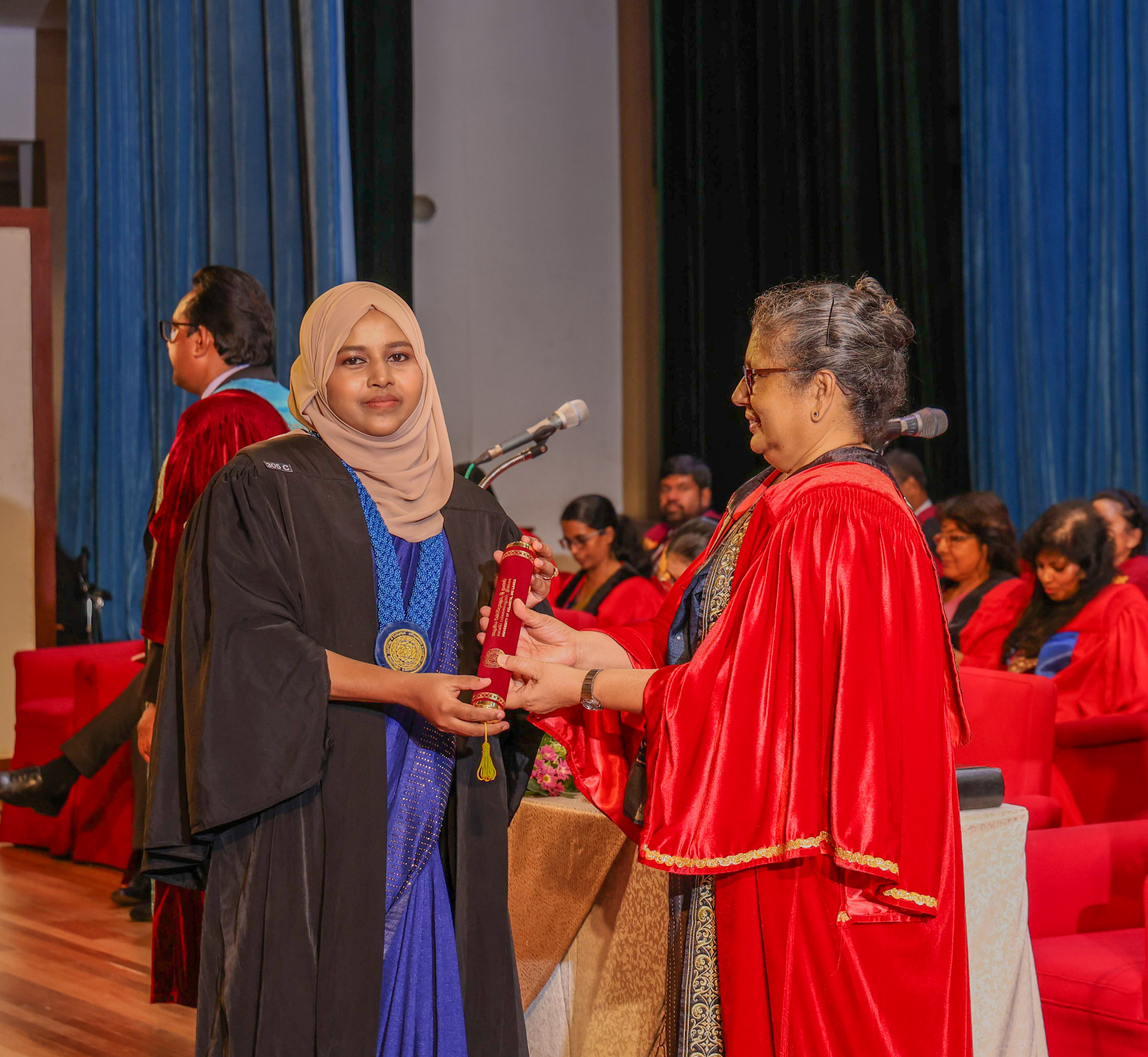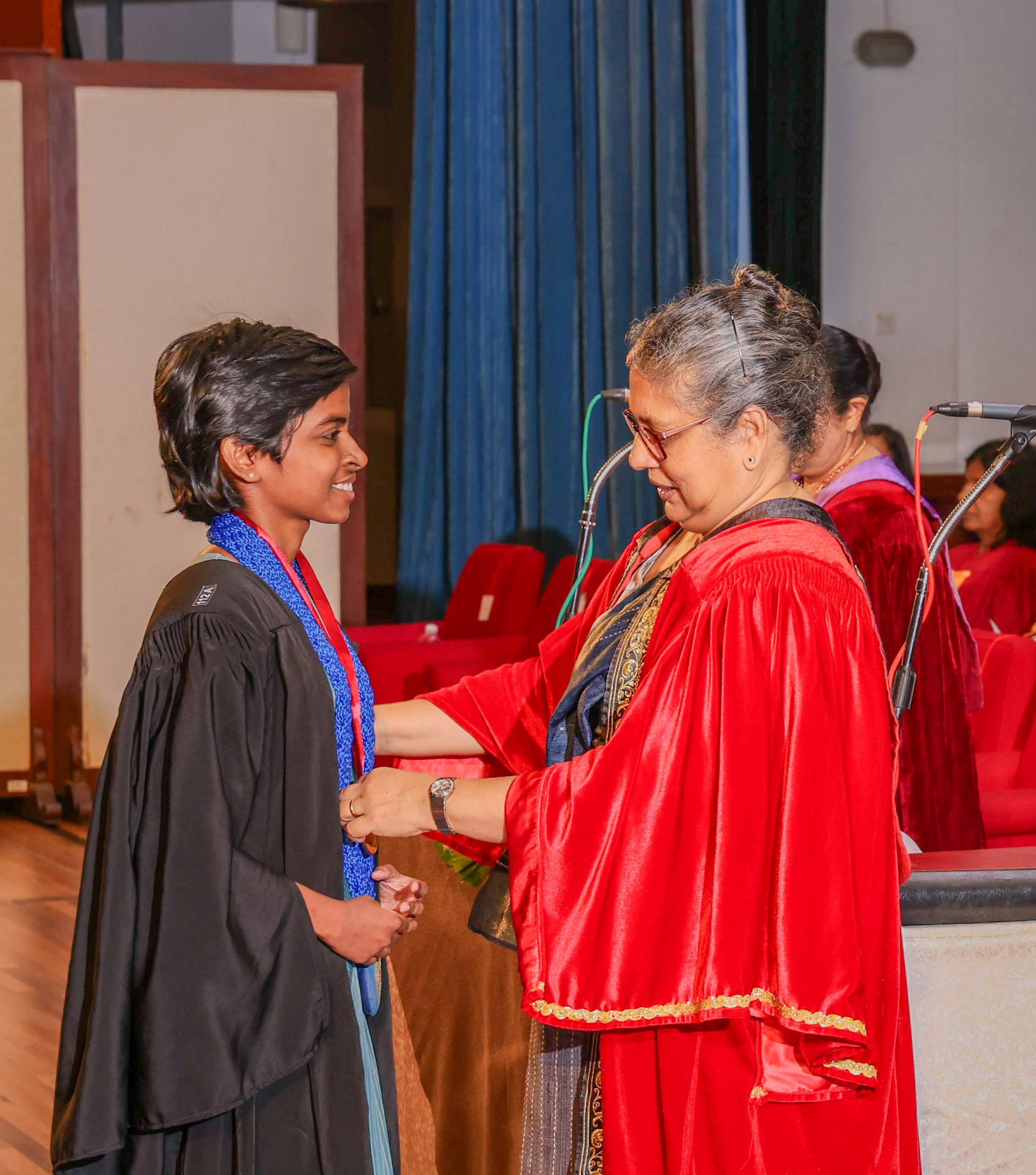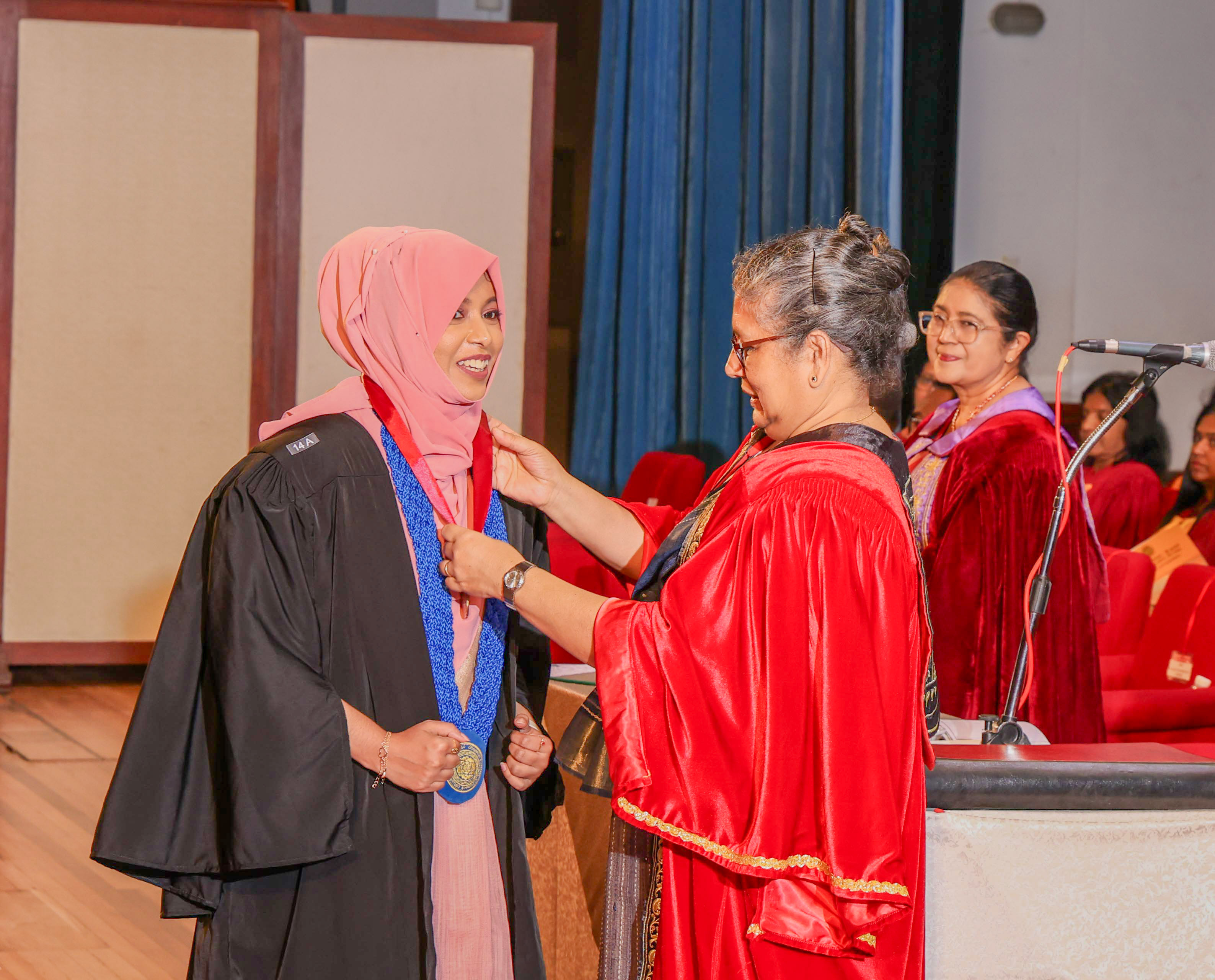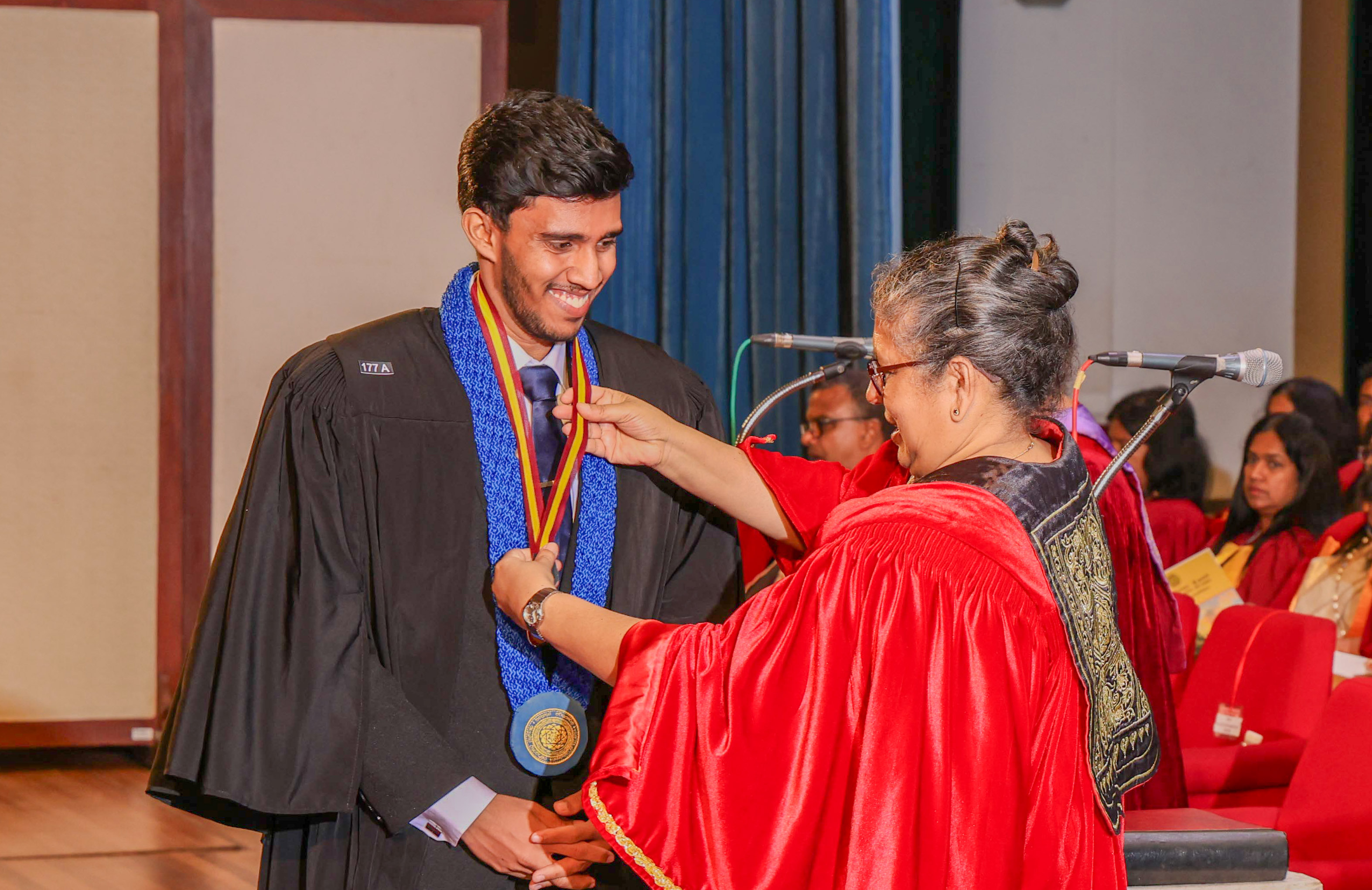At this session, Ms Helani Udara Seekkubadu was awarded the Venerable Ratmalane Sri Dharmarama Thero Memorial Gold Medal, offered by the Alumni Association of the University of Kelaniya, for obtaining the highest marks for the B.A. Honours degree examinations of the Faculty of Science, and the Gold medal awarded by the Alumni Association of the Faculty of Science, for obtaining the highest GPA in Bachelor of Science Honours in Software Engineering. Ms Jayasundara Pathirannehelage Harini Githma Jayasundara was awarded the Mastercard Digital Excellence Gold Medal, offered by the Mastercard Singapore Holding Pte. Ltd. for showing excellence in the Digital Innovation Research Project under the Bachelor of Science Honours Degree in Management and Information Technology. Ms Jeevaraj Sapthiha Priyatharshini was awarded the Gold Medal for Academic Excellence, offered by the academic staff members of the Department of Industrial Management for showing excellence in Business Systems Engineering under the Bachelor of Science Honours Degree in Management and Information Technology. Ms Sachintha Abhayagunawardhana Weerasinghe was awarded the Gold medal awarded by the Alumni Association of the Faculty of Science, for obtaining the highest GPA in Bachelor of Science Honours in Computer Science. Ms Imbulana Badalge Amaya Chamini Imbulana was awarded the Gold medal awarded by the Alumni Association of the Faculty of Science, for obtaining the highest GPA in Bachelor of Science Honours Degree in Environmental Conservation & Management. Ms Ragavee Mekala Saras Chandran was awarded the Gold medal awarded by the Alumni Association of the Faculty of Science, for obtaining the highest GPA in Bachelor of Science Honours in Mathematical Physics. Ms Dona Aravindya Diyathini Weththasinghe was awarded the Gold medal awarded by the Alumni Association of the Faculty of Science, for obtaining the highest GPA in Bachelor of Science Honours in Molecular Biology & Plant Biotechnology. Ms Amal Cader Mohideen Mohideen was awarded the Gold medal awarded by the Alumni Association of the Faculty of Science, for obtaining the highest GPA in Bachelor of Science Honours in Zoology. Ms Rajaguru Mudiyanselage Bimba Madhubhashini Sathsarani Rajaguru was awarded the Professor C. Dahanayake Memorial Gold Medal, offered by the Department of Physics and Electronics, for showing excellence in Physics, and the Gold medal awarded by the Alumni Association of the Faculty of Science, for obtaining the highest GPA in Bachelor of Science Honours in Physics. Mr Buddhima Priya Abeyweera Gunawardena was awarded the Professor H. H. Costa Memorial Gold Medal, offered by the Department of Zoology and Environmental Management, for obtaining the highest GPA in the Bachelor of Science Honours in Zoology Degree Programme. Ms Biyagama Thenannahalage Vishmi Gunatilaka was awarded the Gold Medal offered by the Sarojini Jayawardane Memorial Gold Medal for obtaining the highest marks in Bachelor of Science Honours in Microbiology, and the Gold medal awarded by the Alumni Association of the Faculty of Science, for obtaining the highest GPA in Bachelor of Science Honours in Microbiology. Mr Meegasmullage Tharuka Sandaruwan was awarded the Gold Medal for the Most Outstanding Student, offered by the academic staff members of the Department of Industrial Management, showing excellence in both academic and extra-curricular activities in the Bachelor of Science Honours in Information Technology. Mr Hitihamillage Nihim Nusith Abhayarathne was awarded the Gold Medal for the Most Outstanding Student, offered by the academic staff members of the Department of Industrial Management, showing excellence in both academic and extra-curricular activities in the Bachelor of Science Honours in Management and Information Technology. Mr Wedikkara Arachchige Savindu Harith was awarded the Gold Medal for Academic Excellence, offered by the academic staff members of the Department of Industrial Management, for showing excellence in Information Technology course modules in the Bachelor of Science Honours in Information Technology. Ms Selvakumar Thakshanah was awarded the Gold Medal for Academic Excellence, offered by the academic staff members of the Department of Industrial Management, for showing excellence in Management and Technology course modules in the Bachelor of Science Honours in Information Technology. Ms Ranaraja Pathirana Basnayakalage Nethmi Amaya Senarathne was awarded the Gold Medal for Academic Excellence, offered by the academic staff members of the Department of Industrial Management, for showing excellence in Business Systems course modules in the Bachelor of Science Honours in Management and Information Technology, and the Gold medal awarded by the Alumni Association of the Faculty of Science, for obtaining the highest GPA in Bachelor of Science Honours in Management and Information Technology. Ms Pihilikumbure Gedara Sajani Jeewanthi Pihilikumbura was awarded the Gold medal awarded by the Alumni Association of the Faculty of Science, for obtaining the highest GPA in Bachelor of Science Honours in Biochemistry. Ms Warnakulasuriya Weerakonda Arachchige Dinuki Rangika Fernando was awarded the Gold medal awarded by the Alumni Association of the Faculty of Science, for obtaining the highest GPA in Bachelor of Science Honours in Information Technology. Ms Waduge Ann Hiruni Shashikala Livera was awarded the Gold medal awarded by the Alumni Association of the Faculty of Science, for obtaining the highest GPA in Bachelor of Science Honours in Chemistry. Ms Samarakoon Mudiyanselage Dulanji Madushika Kumari Samarakoon was awarded the Gold medal awarded by the Alumni Association of the Faculty of Science, for obtaining the highest GPA in Bachelor of Science Honours in Statistics. Ms Wallahagolle Gedara Mahesha Pavithrani Dissanayake was awarded the Gold medal awarded by the Alumni Association of the Faculty of Science, for obtaining the highest GPA in Bachelor of Science 